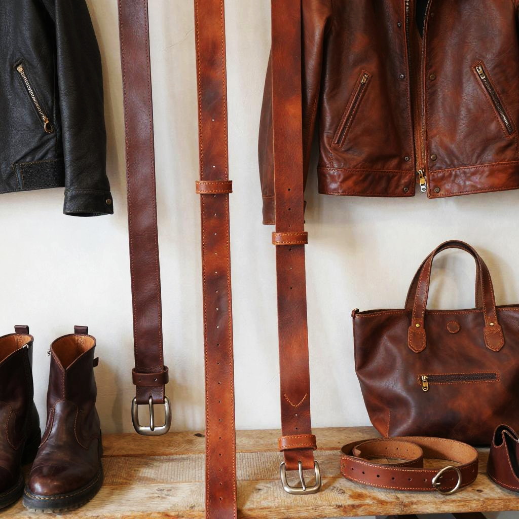 Leathers displayed in a rustic artisan workshop, hand-stitched craftsmanship on belts, jackets, and accessories, warm natural lighting highlighting the rich textures and rugged elegance of the materials.