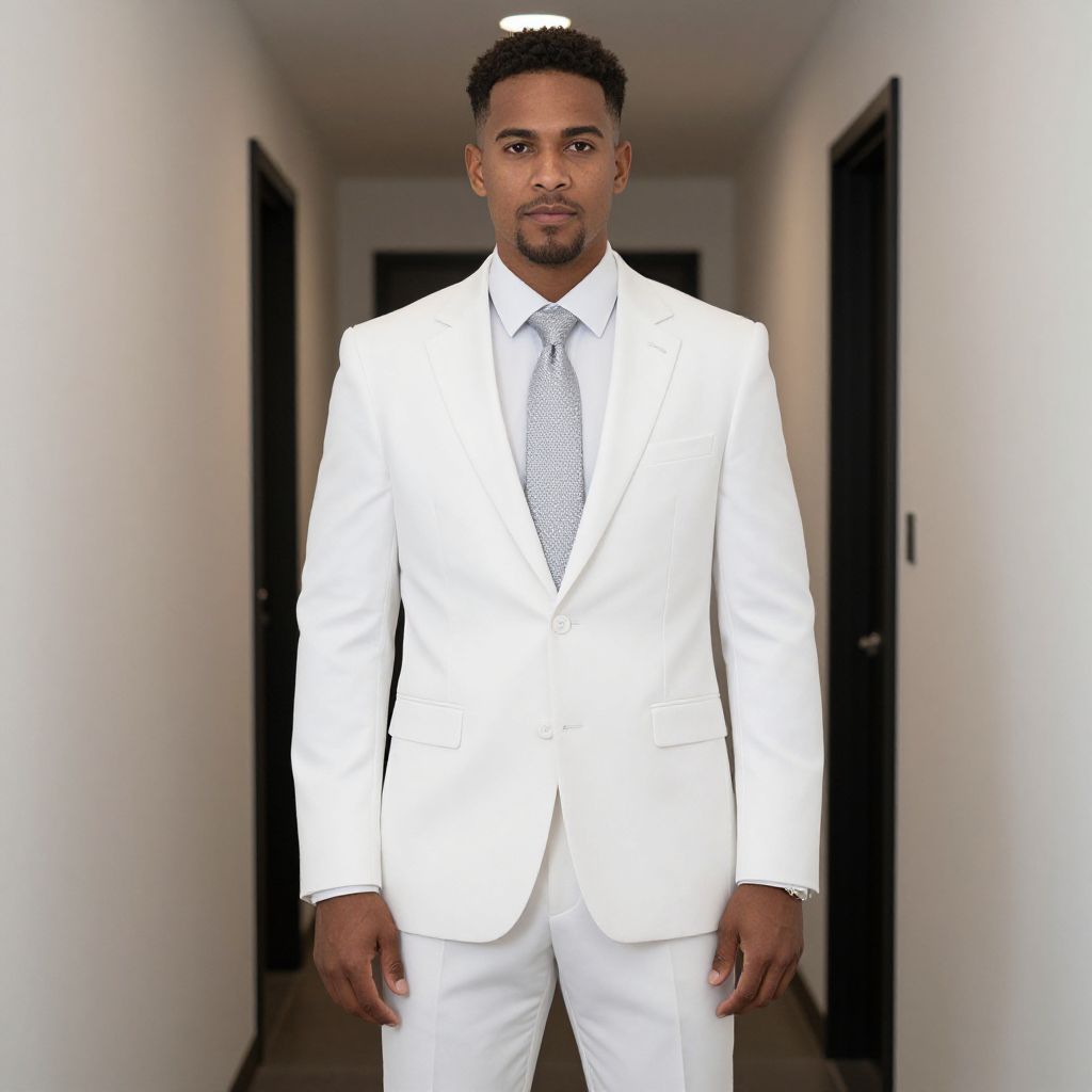 Photograph of a confident Black man in a sharp white suit with a white shirt and patterned tie, standing in a white-walled hallway with black