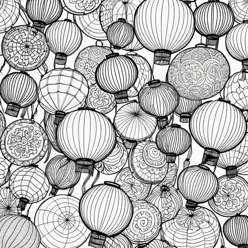 Japanese floating paper lanterns, high-detail adult coloring page, crisp black outlines on white, storybook illustration, designed for coloring, fills entire screen with intricate patterns