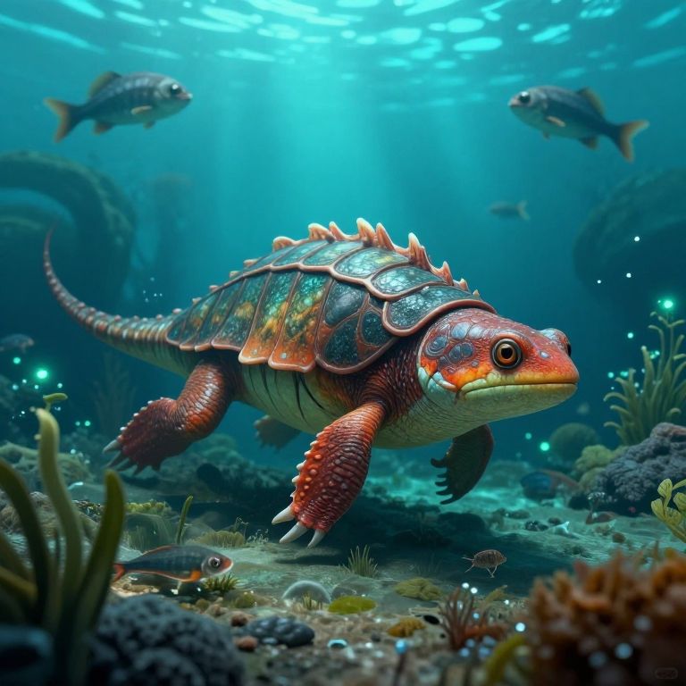 Digital artwork of a vibrant, red-spiked, turtle-like sea creature swimming amid underwater coral, surrounded by small fish and illuminated by blue light rays.