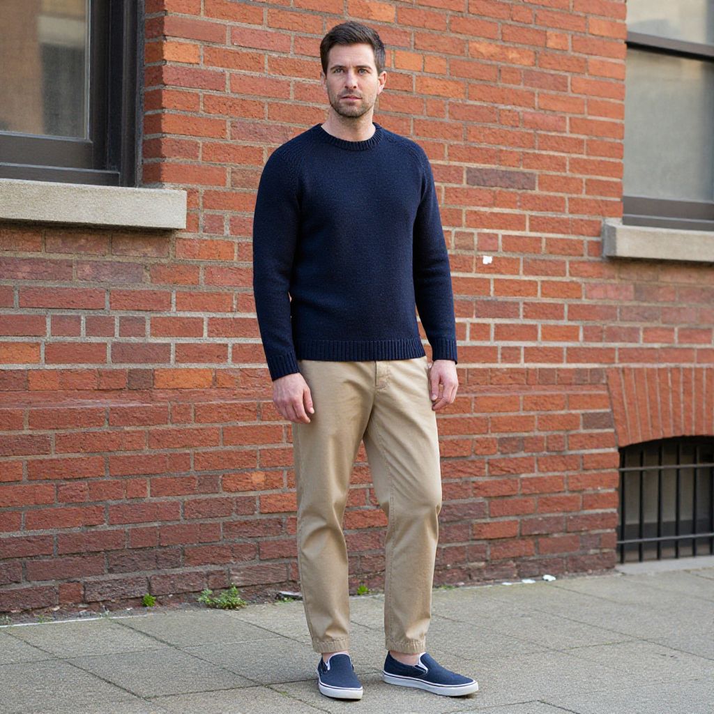 A man, navy blue Urban Explorer Knit Sweater, beige chino joggers, canvas slip-on shoes, relaxed fit, standing in front of a red brick building, ib technicolor film stock, thoughtful expression, warm sunlight illuminating the scene. Man has masculine face and piercing eyes