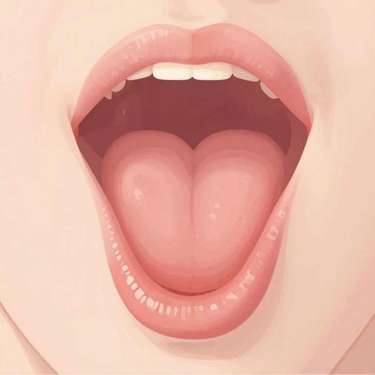 Digital illustration of a close-up, open mouth with full, pink lips and white teeth. The tongue is prominently visible, curled slightly at the tip and centered in the mouth. The inner mouth is a dark pink, contrasting with the lighter pink of the lips and tongue. The skin surrounding the mouth is very pale. The image has a smooth, glossy texture and a slightly exaggerated, cartoon-like style. There are no other objects or background elements, focusing solely on the detailed depiction of the mouth and tongue.