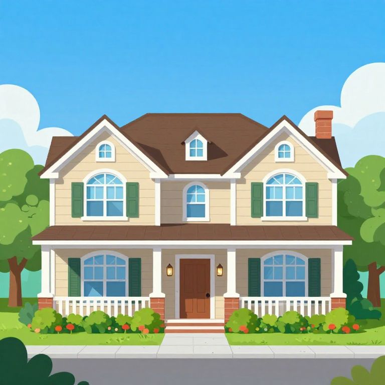 A vibrant cartoon-style illustration showcases a charming Southern home with a front elevation plan featuring a symmetrical design, arched windows, and a welcoming entrance, rendered in bright colors and detailed landscaping against a clear blue sky.