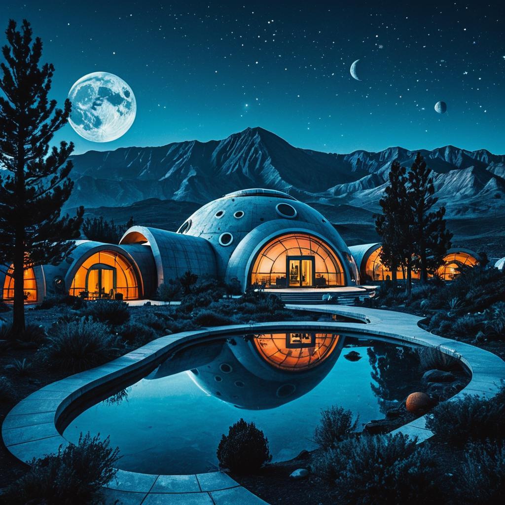 A futuristic dome-shaped building situated in a surreal alien landscape with mountains in the background. A large moon with visible craters and several small stars are visible in the twilight sky. The setting includes a pathway leading to the structure surrounded by small trees, bushes, and reflective pools of water, combining cool blue tones from the building and warm orange from the sky, creating a dramatic and otherworldly atmosphere.