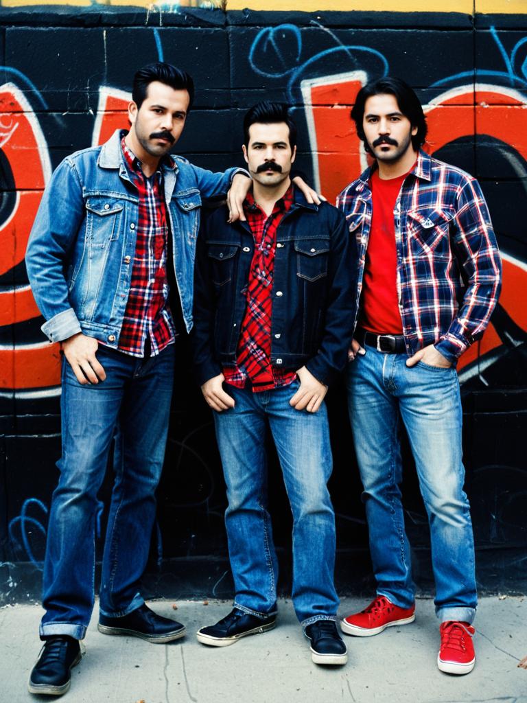 Dad costume, shirt, multiple boys, male focus, facial hair, plaid shirt, denim, pants, belt, 2boys, jeans, mustache, beard, graffiti, blue shirt, plaid, standing, jacket, black hair, red shirt, shoes, open clothes