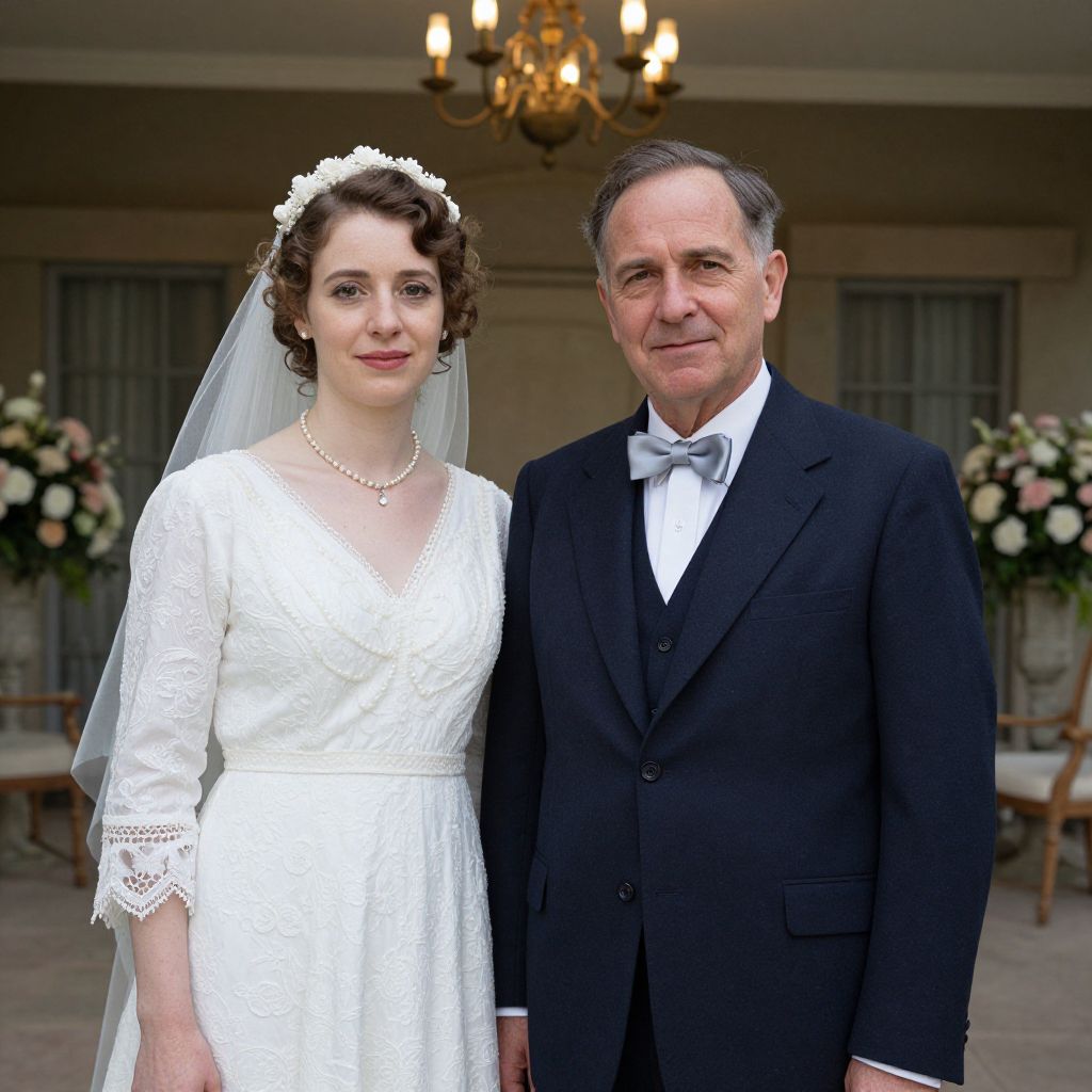 A natural light photograph of a man in his 50s with a gentle facial expression, slightly weathered but kind eyes, dressed in a classic 1930s wedding suit with a silk bow tie, standing beside a bride in a vintage white wedding gown with embroidery and pearl accents, outdoors on a stone patio with chandeliers hanging from the ceiling, soft floral decorations around them