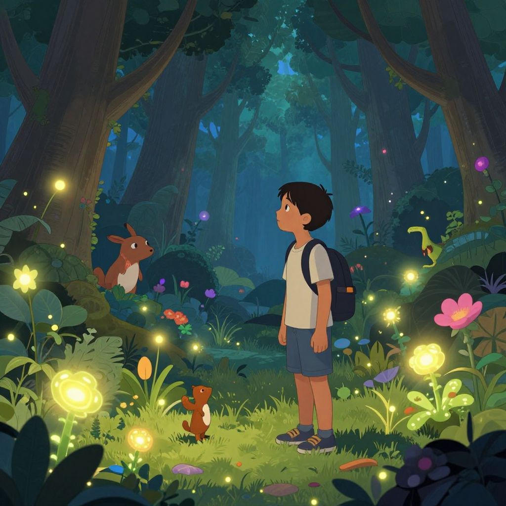 Illustration of a young boy with a backpack, standing in a magical, glowing forest at night, surrounded by fireflies, flowers, and a playful