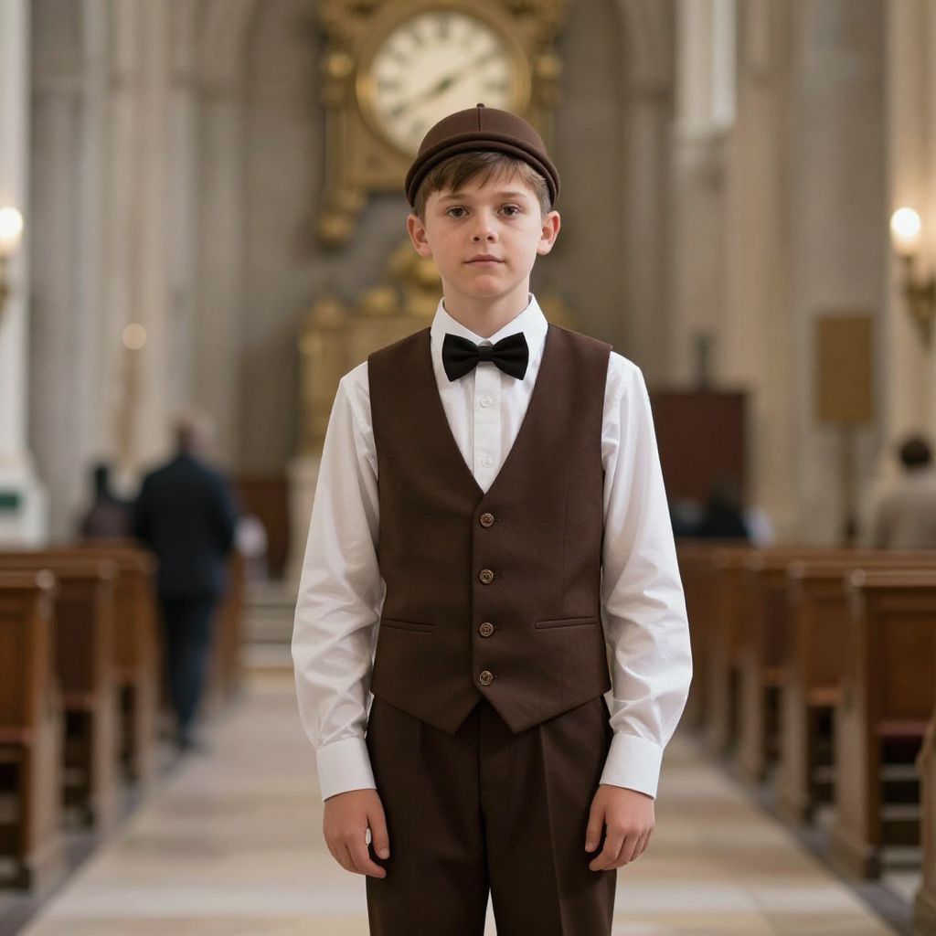 Parisian costume, 1boy, male focus, solo, hat, clock, blurry, blurry background, indoors, pants, looking at viewer, brown headwear, long sleeves, vest, church, bow, white shirt, standing, shirt, realistic