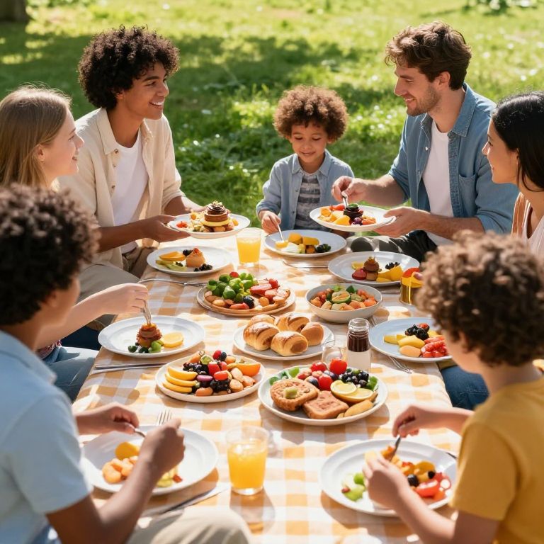 Photograph of diverse, mixed-gender family enjoying a sunny outdoor picnic with colorful food, drinks, and laughter on a checkered tablecloth.
