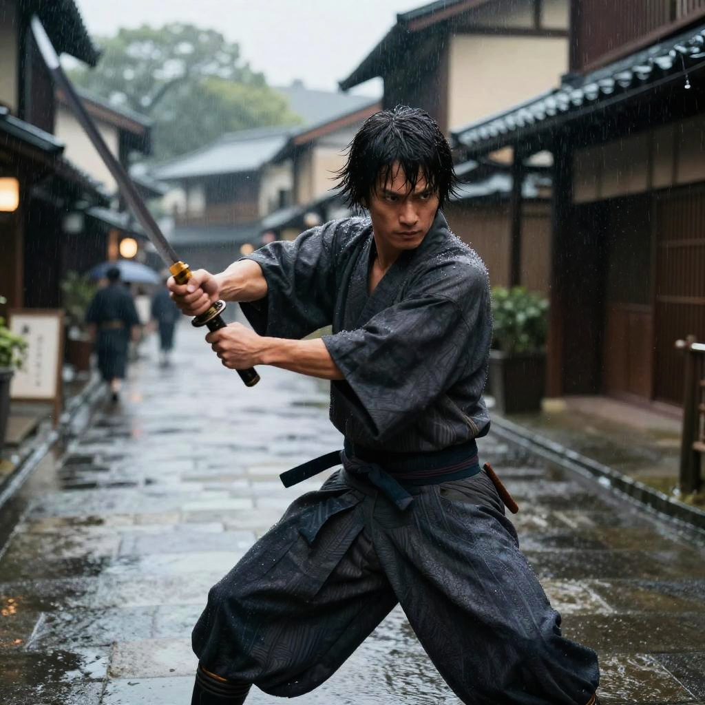 Focused samurai dressed in traditional dark kimono, swinging a katana on a rain-soaked stone street in a historic Edo-period Japanese town. Wet hair and intense expression highlighting powerful motion with raindrops splashing around. Traditional wooden buildings line the blurred background.