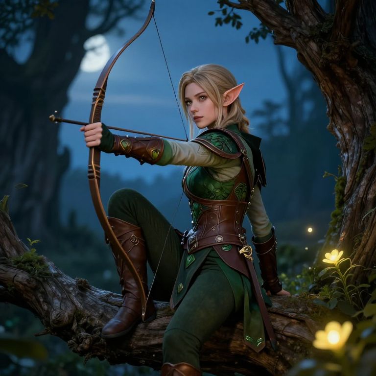 A digitally rendered fantasy image features a blonde, elf-like woman with pointed ears, drawing a wooden bow in a moonlit forest. She wears green and brown medieval-style armor, with leather bracers and boots, and a green tunic. Her piercing blue eyes focus intently on the target. She is perched on a moss-covered fallen tree, with glowing fireflies surrounding her. The background shows tall, shadowy trees under a deep blue night sky with a bright full moon. Her strong, determined expression and poised stance exude a sense of readiness and skill. The detailed textures and vibrant colors enhance the realistic fantasy style.