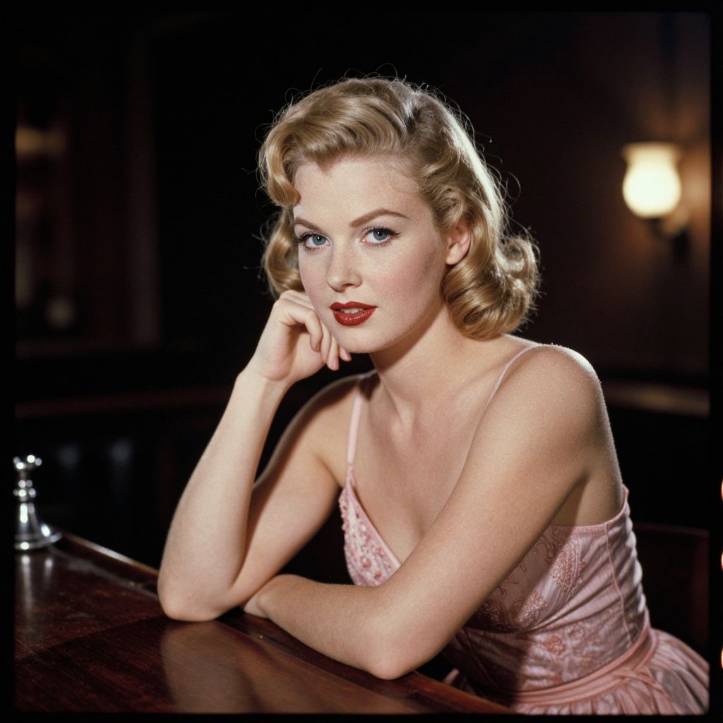 Photograph of a fair-skinned, blonde woman with vintage-style, curled hair wearing a pink, lace-trimmed, spaghetti-strap nightgown. She rests her chin on her hand, gazing slightly to the side with red lipstick accentuating her lips. The background is dark with a blurred, warm light source on the right. She is seated at a polished wooden bar, with a silver bottle partially visible to the left. Her expression is sultry and confident, evoking a classic 1940s Hollywood glamour style.