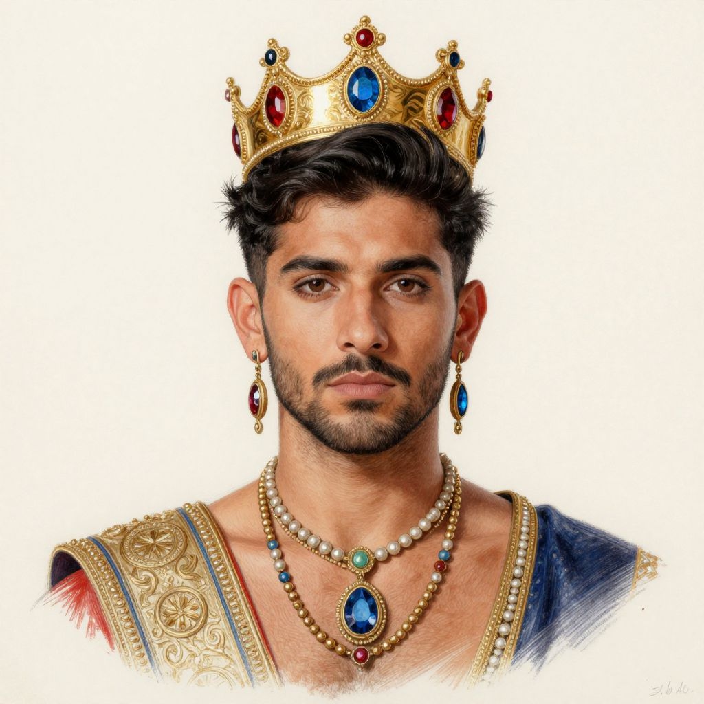 Festival costume drawing, 1boy, male focus, solo, jewelry, earrings, facial hair, necklace, black hair, looking at viewer, mustache, crown, upper body, realistic