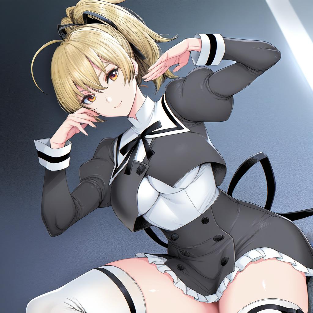 Andou tazusa, assault lily, 1girl, hand up, red eyes, hair between eyes, blonde hair, short hair, ponytail, ahoge, high ponytail, hair ribbon, medium breasts, yurigaoka girls academy school uniform, yurigaoka girls academy school uniform, cropped jacket, white shirt, black skirt, white thighhighs, high-waist skirt, frilled skirt, black ribbon, neck ribbon, juliet sleeves, miniskirt, buttons, by artist fei (maidoll), leet