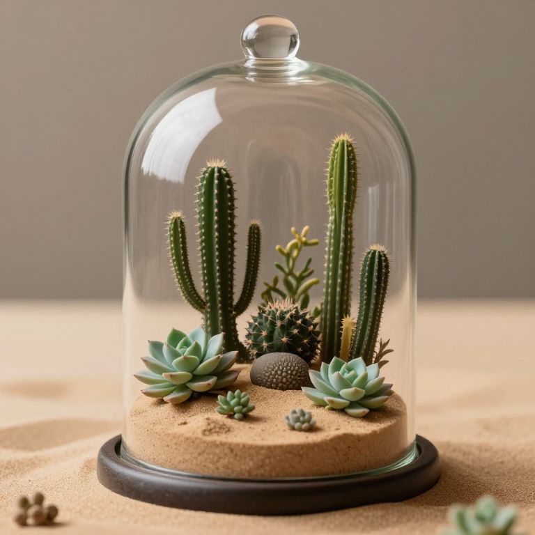 Within the confines of a glass bell jar, a miniature desert oasis thrives, embodying resilience and serenity, while the soft whispers of sand and the gentle rustle of succulents evoke a timeless connection to forgotten worlds.