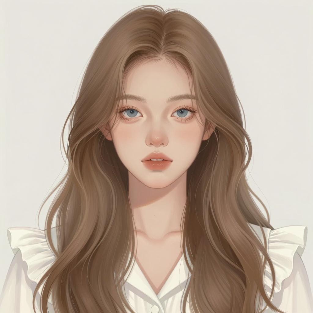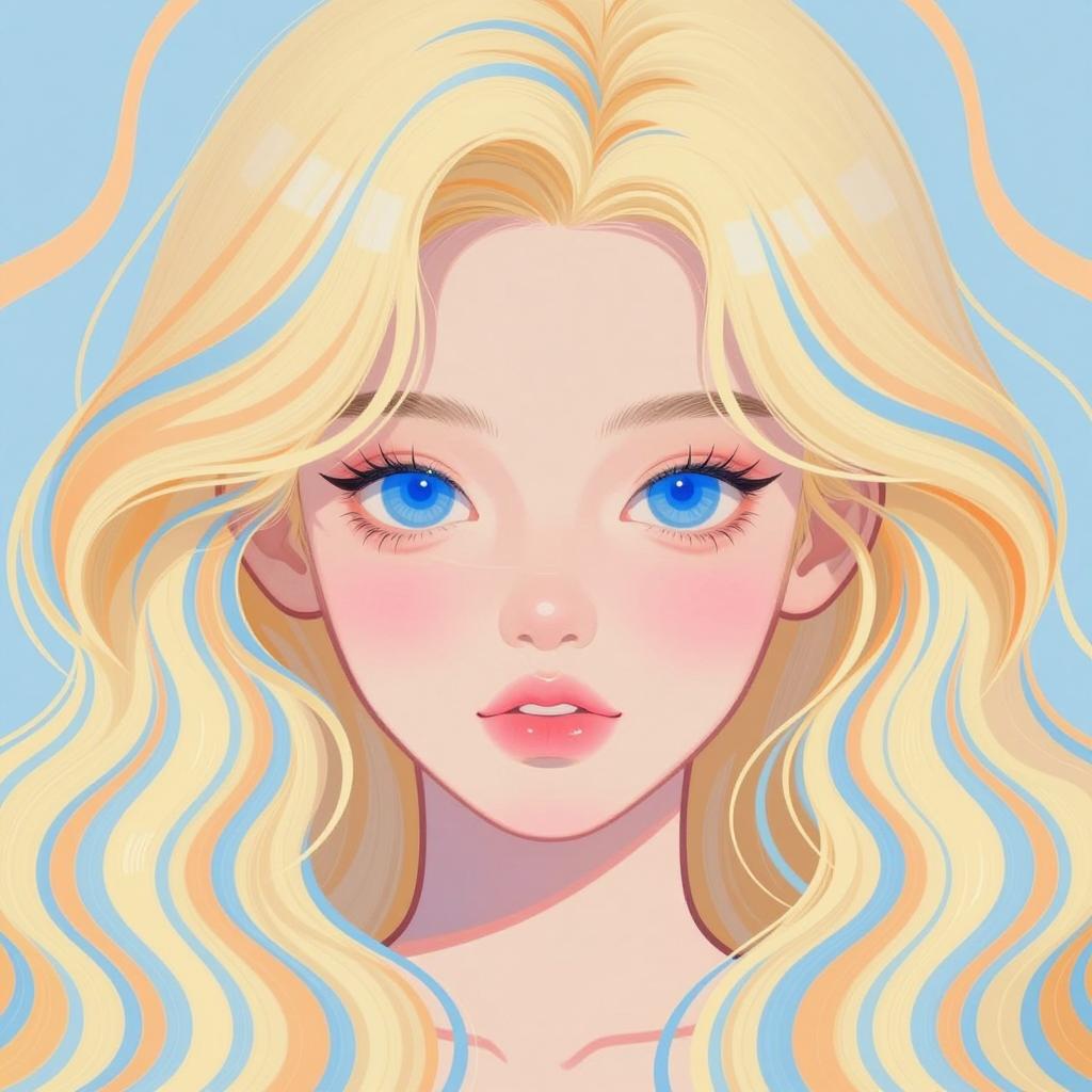 Digital illustration of a fair-skinned young woman with blue eyes and brown wavy hair. She wears a wide-brimmed hat and matching outfit featuring vibrant patterns in blue, orange, yellow, and purple. Her cheeks have a soft pink blush and she wears large, ornate earrings that complement her attire. The background consists of colorful decorative tiles creating a harmonious and artistic composition.