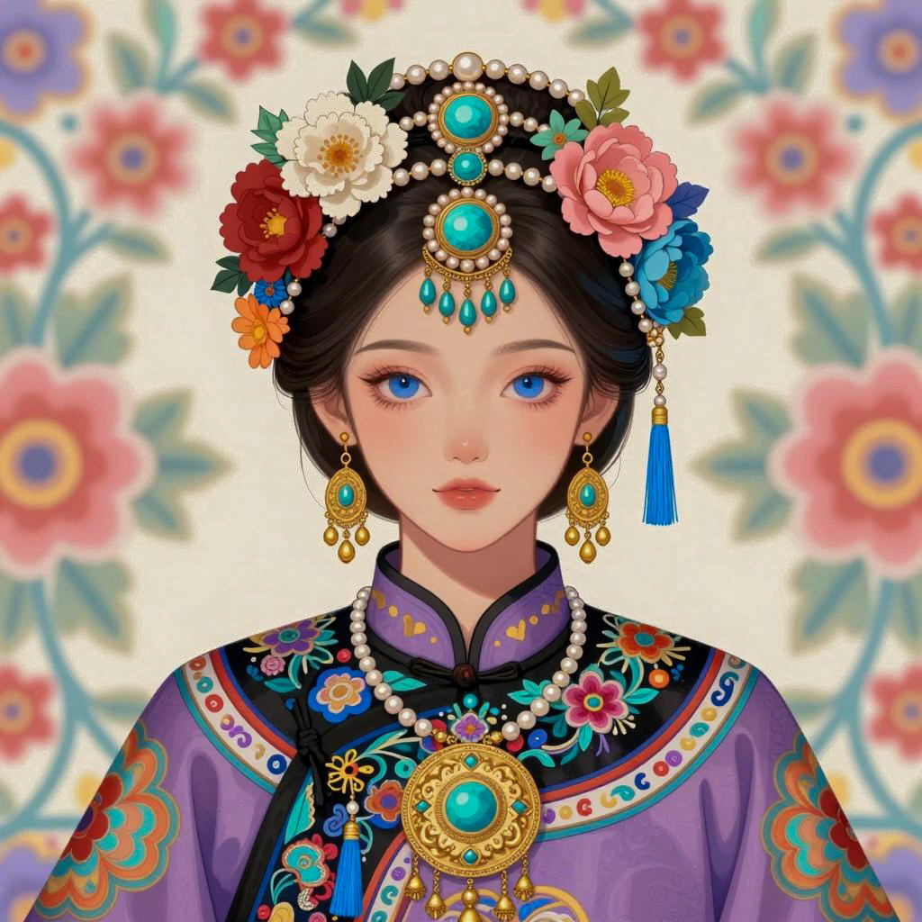 Digital illustration of a fair-skinned woman with blue eyes, wearing a -patterned hat and matching clothing. Her brown wavy hair cascades around her shoulders. She has pink cheeks and wears large, ornate earrings. The background is filled with colorful patterns. She gazes directly at the viewer with a calm expression. The tiles feature colors like blue, orange, yellow, and purple.