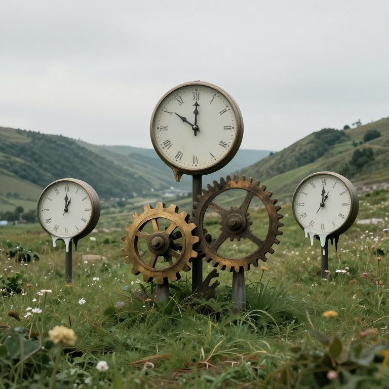 In a serene valley where time defies convention, clocks with backward-moving hands and melting gears stand as silent sentinels, inviting contemplation on the fluidity of moments and the eternal dance between past and future.