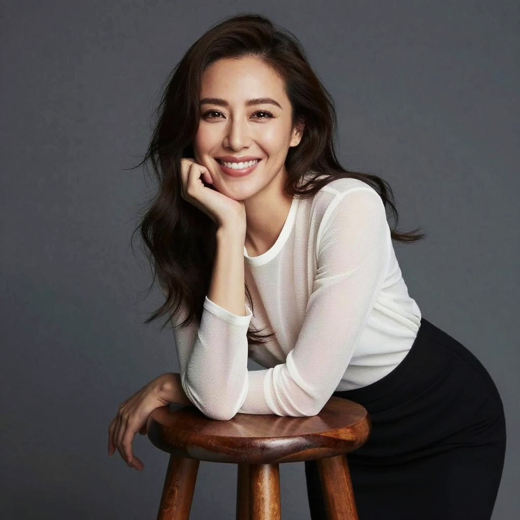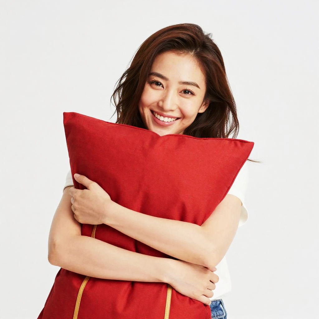 Smiling Asian woman with long black hair hugs a bright red pillow, wearing a white sleeveless top, against a white background.