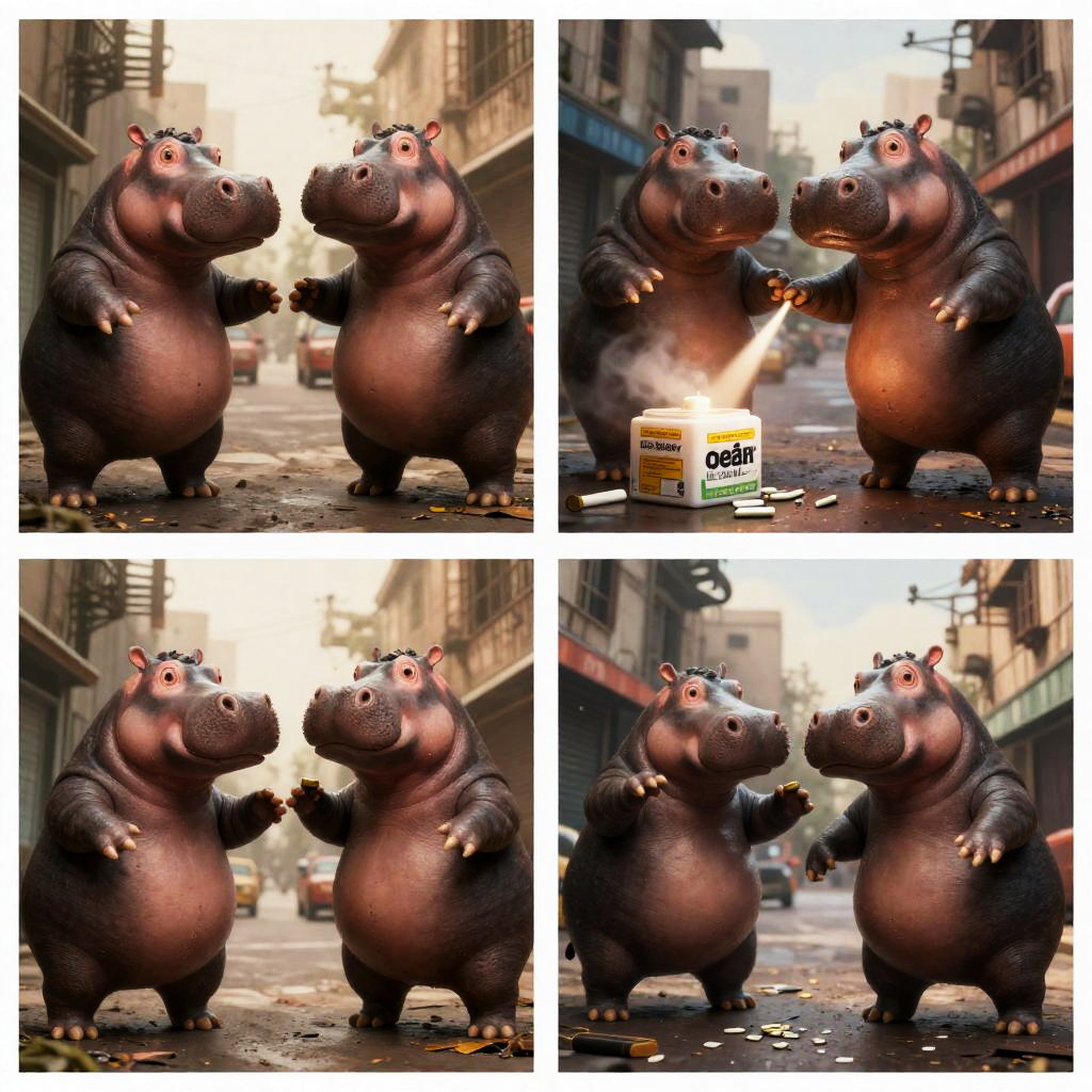 Realistic photo.Action Painting single panel comic telling a dramatic story about a feared hippo clan selling drugs and fighting in the streets, Cartoon, gangsta hypebeast faceless hippos, ghetto, lo-fi, album cover, ultra-detailed realistic photo