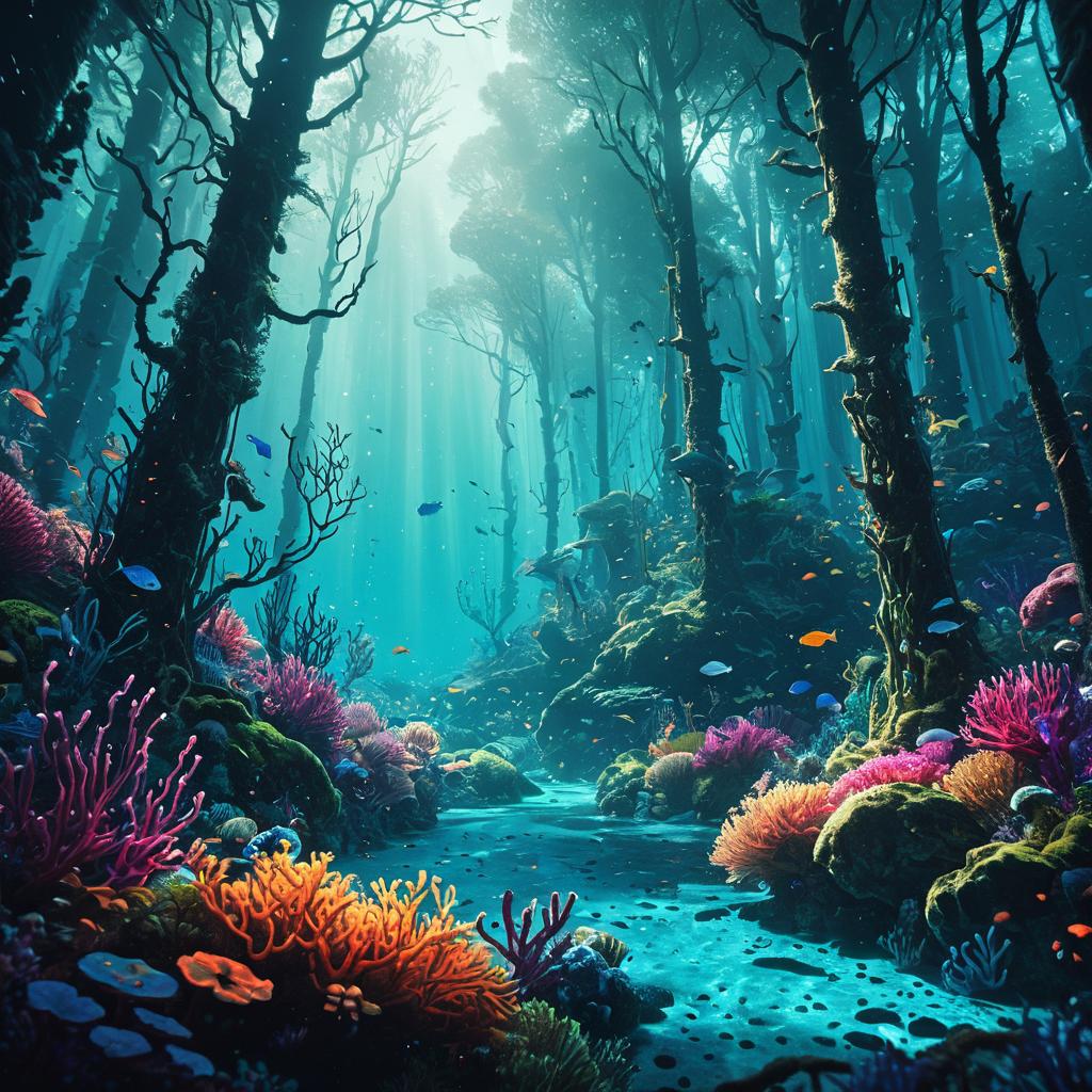 Highly detailed fantasy illustration of ancient deep-sea ruins with classical architectural towers. Vibrant blue underwater scene with colorful coral and marine life. Magical glowing light emanates from archways, creating a surreal and mystical atmosphere. Inspired by the artistic styles of Sylvain Sarrailh and Darek Zabrocki.