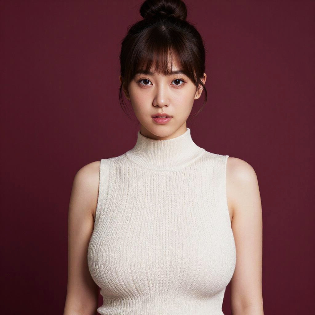 Photograph of an East Asian woman with fair skin and dark hair in a bun with bangs. She wears a sleeveless, high-neck, white knit turtleneck that accentuates her medium-sized breasts. She gazes directly at the camera with a neutral expression. The background is a solid, deep maroon color. The lighting is even, highlighting her smooth skin and the texture of her knit top. The overall style is modern and minimalistic.