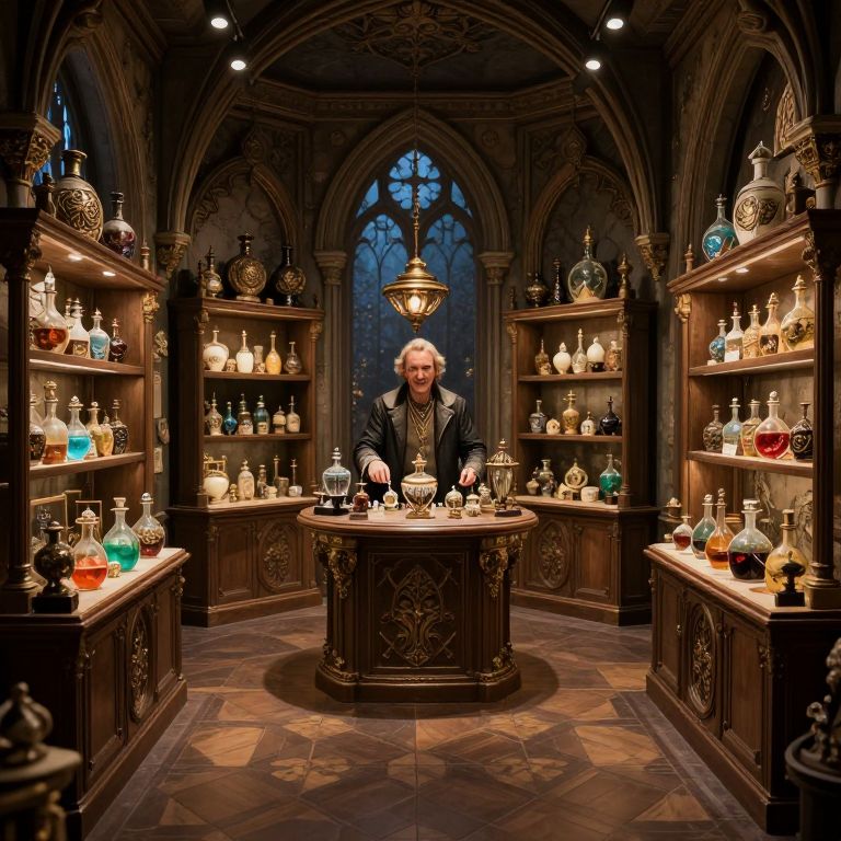 Photograph of a middle-aged man with short blonde hair and a beard, standing behind a wooden, ornately carved apothecary counter in a dimly lit, Gothic-style room. He wears a black jacket over a dark shirt. Shelves on either side of him are filled with colorful glass bottles of various shapes and sizes, containing liquids of different colors. The shelves are illuminated by warm, recessed lighting. The background features arched windows with intricate stone tracery, visible through the blue twilight outside. The floor is made of large, dark tiles. The overall atmosphere is mystical and medieval.