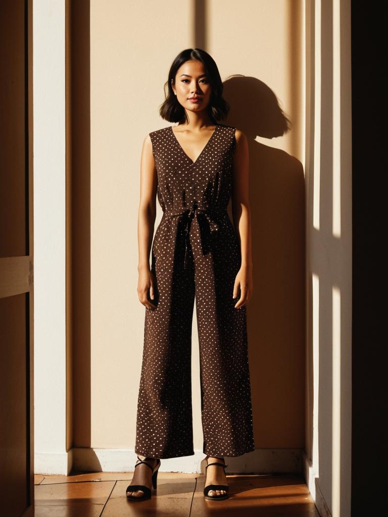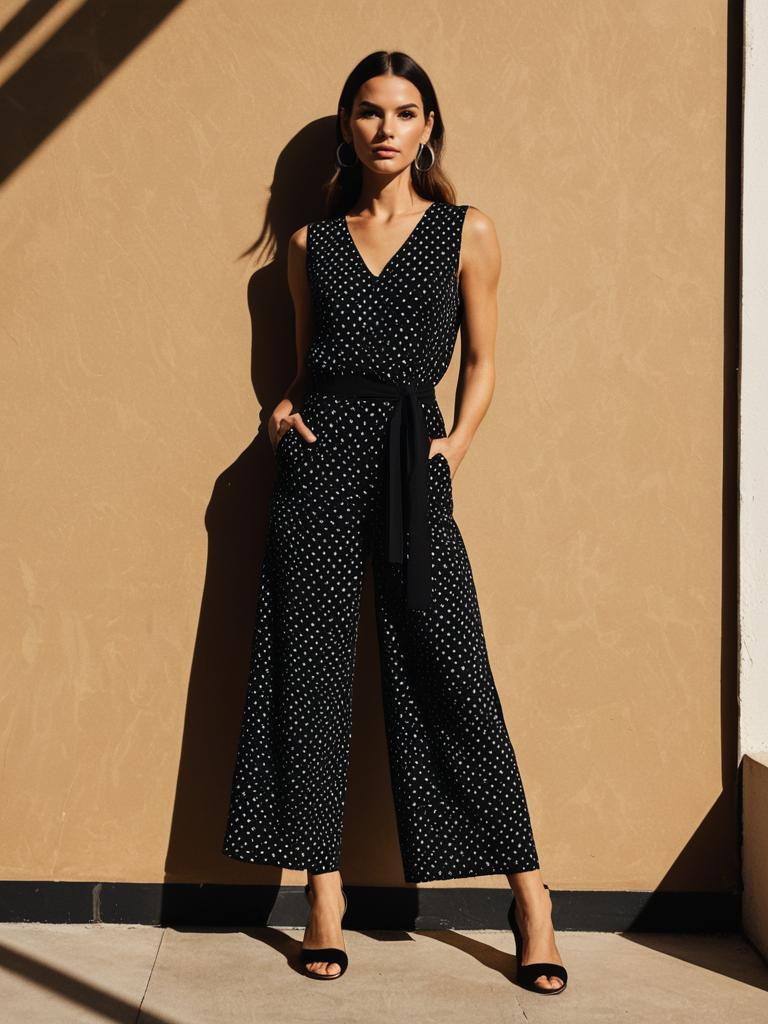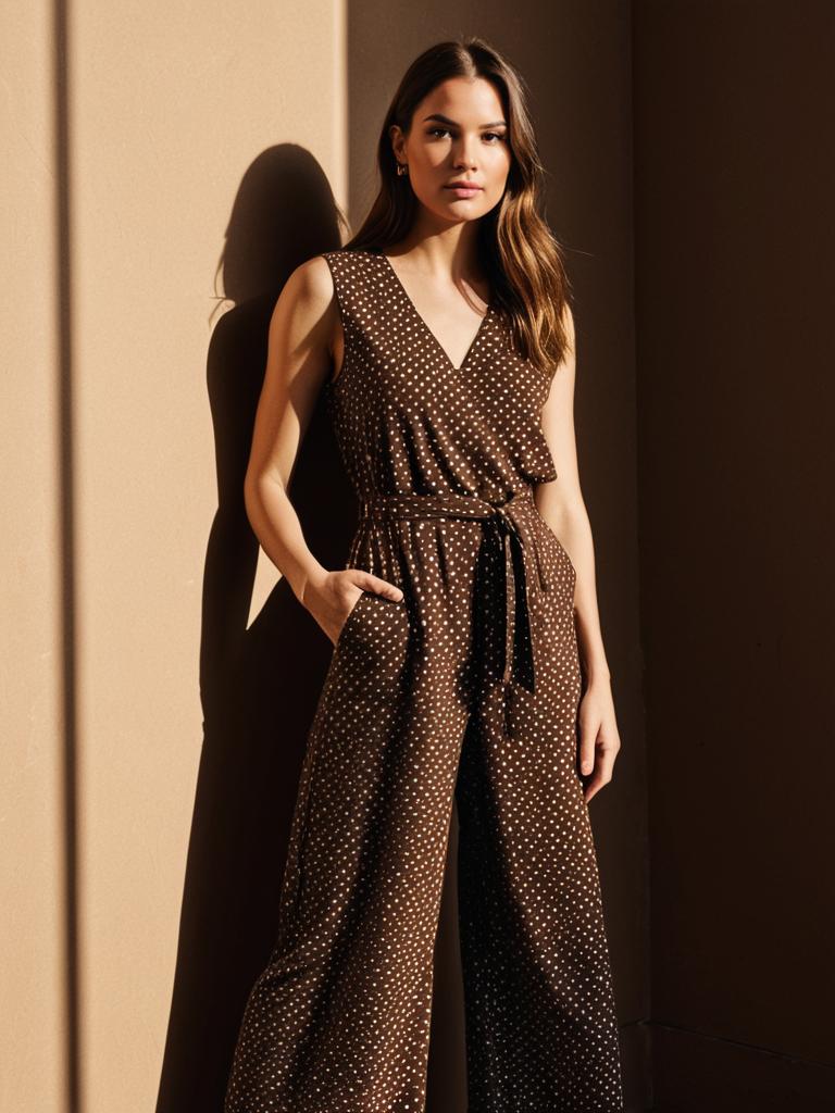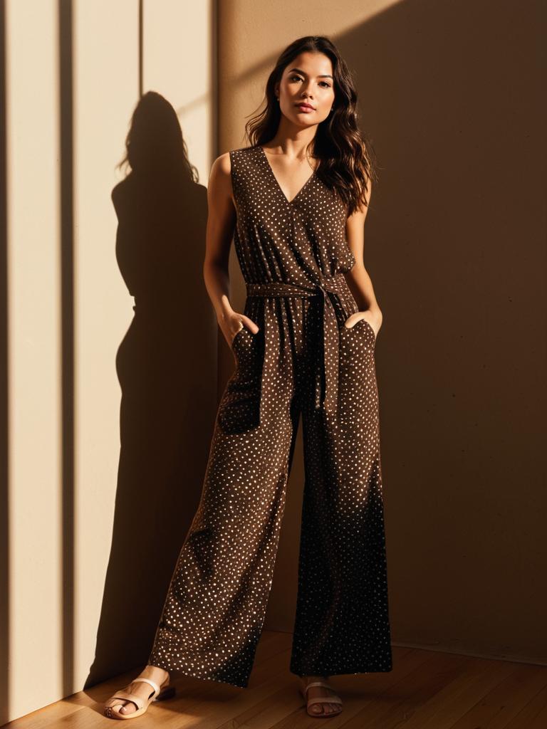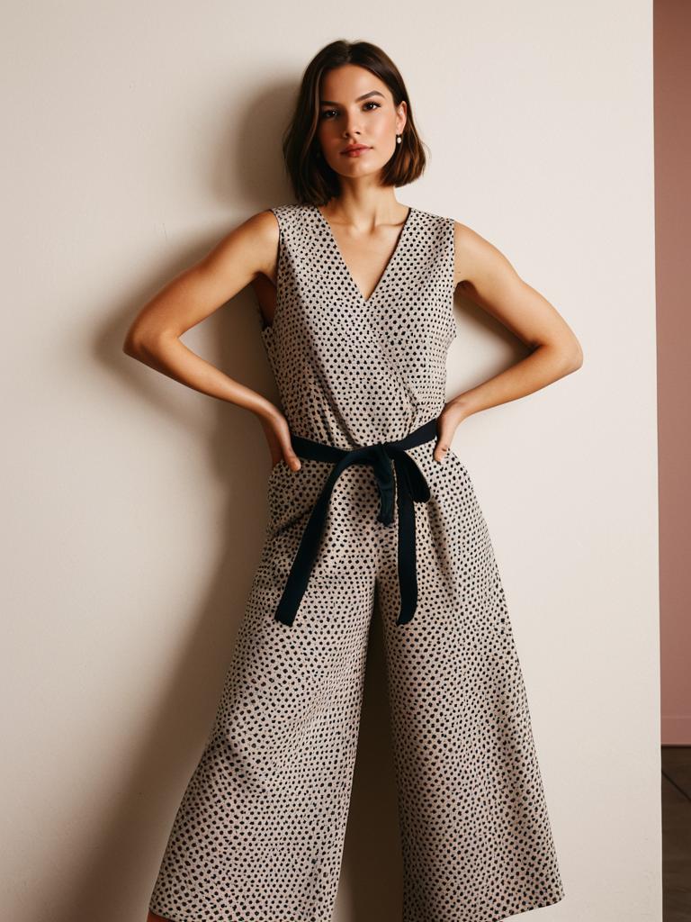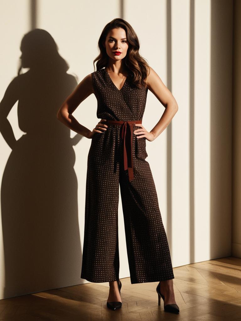 Woman wearing sleeveless V-neck wide-leg jumpsuit with tiny geometric dot print, cropped ankles and self-tie waist belt in charcoal with pale grey micro-print on medium-toned woman with voluminous blowout and peach lipstick posed standing with one hand at her waist and the other at her side in soft tan backdrop with wooden floorboards, single hard light source from the left creating sharp shadow, cinematic editorial fashion photography, high resolution, ultra-detailed