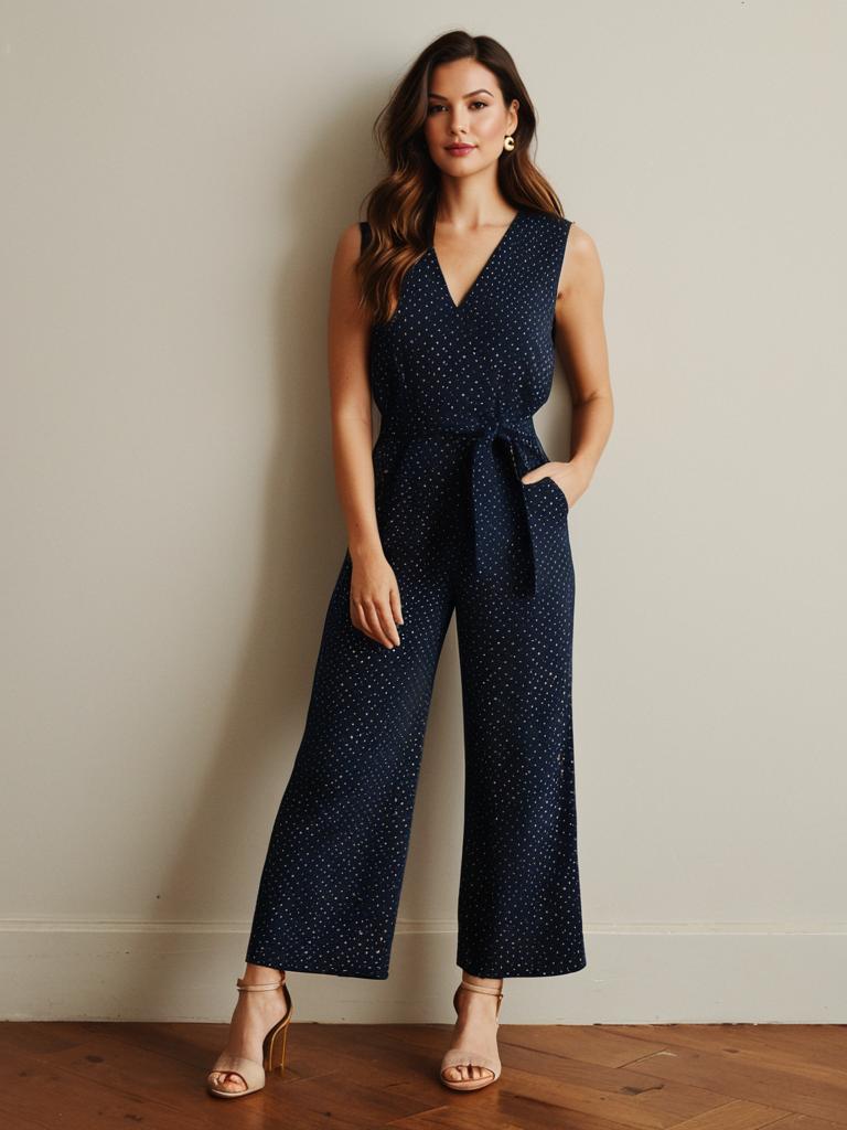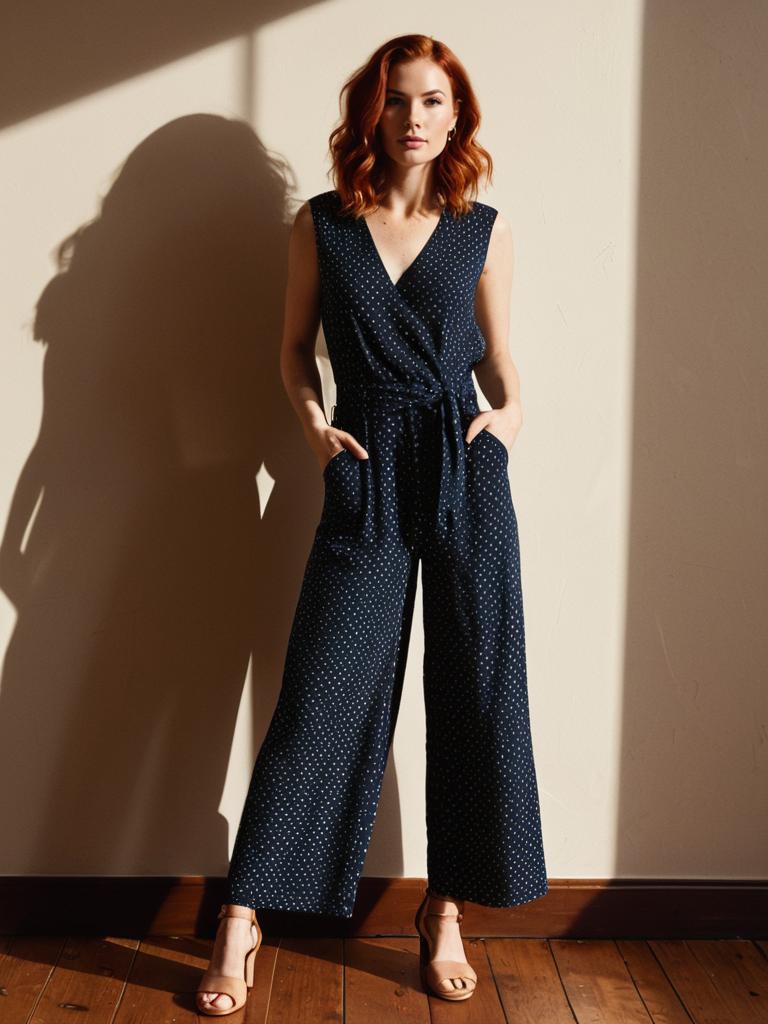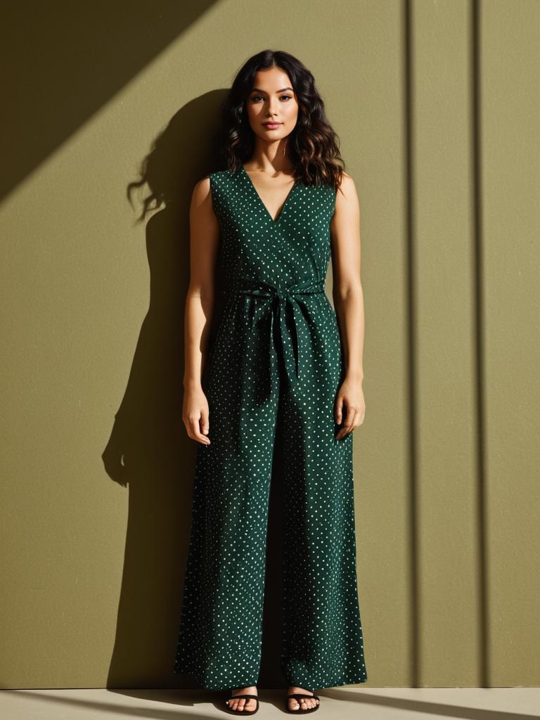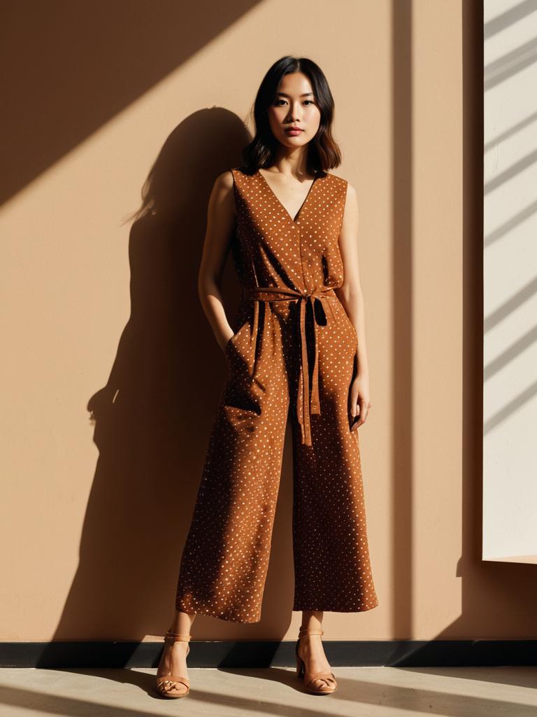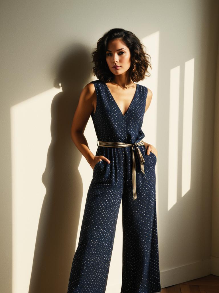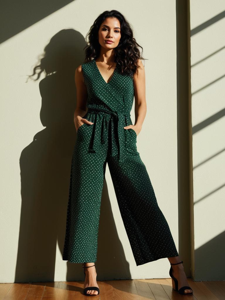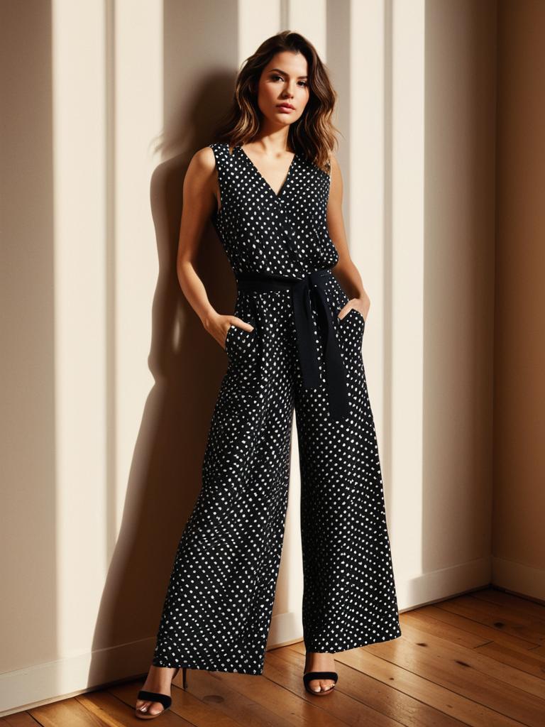 Woman wearing sleeveless V-neck wide-leg jumpsuit with tiny geometric dot print, cropped ankles and self-tie waist belt in charcoal with pale grey micro-print on medium-toned woman with voluminous blowout and peach lipstick posed standing with one hand at her waist and the other at her side in soft tan backdrop with wooden floorboards, single hard light source from the left creating sharp shadow, cinematic editorial fashion photography, high resolution, ultra-detailed