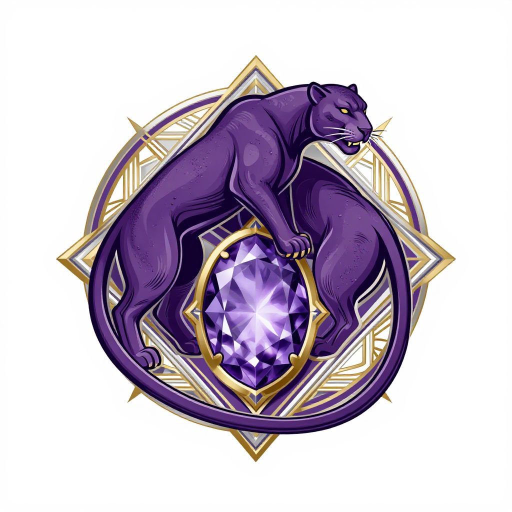 Purple panthers logo depicted as a luxurious emblem, elegant panther silhouette curled around a glowing amethyst gemstone, intricate linework with gold and silver detailing, regal and majestic feel, art deco inspired design with a modern twist