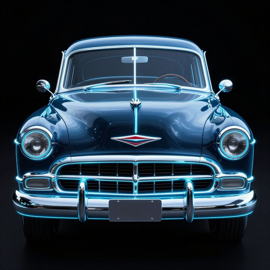 Neon-lit vintage car illustration, front view, showcasing a classic blue 1950s model with glowing headlights and chrome details against a black background