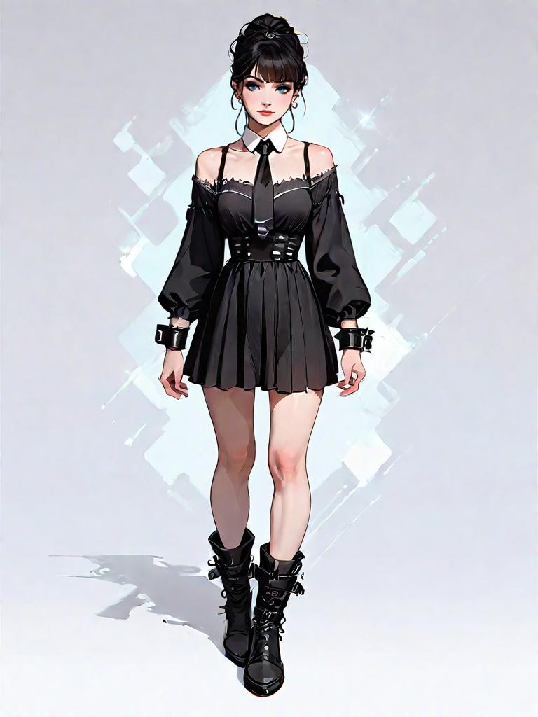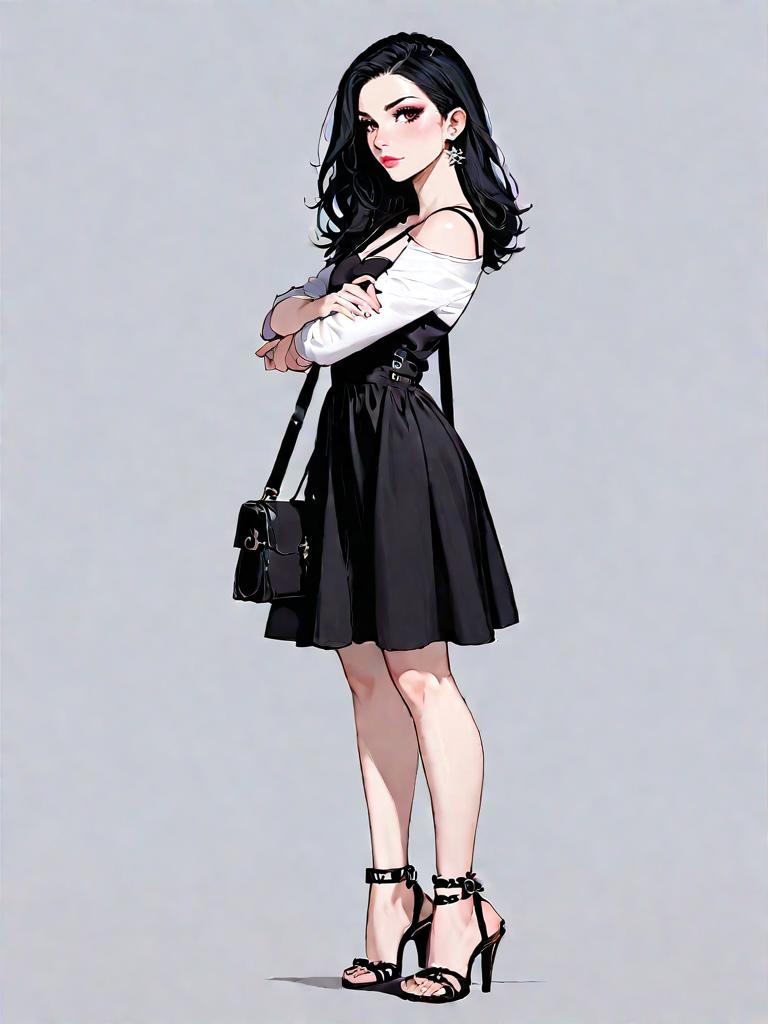 1girl, source_comics, realistic face, full body shot, Woman, modern chic, black ruched mini dress, sweetheart neckline, thin shoulder straps, body-hugging silhouette, accessorized with small black shoulder bag with a silver chain strap, strappy high-heeled sandals, simple stud earrings, white studio background