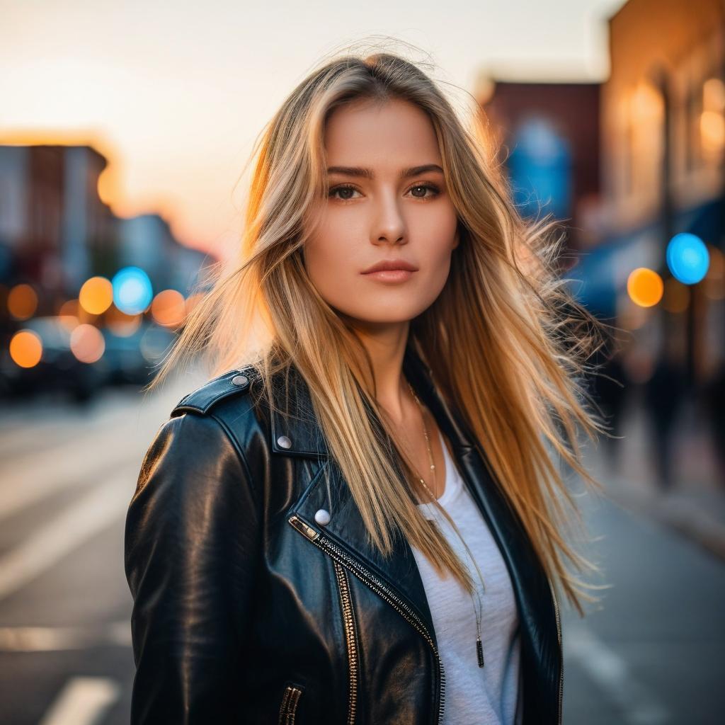 Portrait of a young woman with long blonde hair wearing a black leather jacket on a city street during golden hour, background featuring blurred city lights and storefronts with warm orange and cool blue tones, cinematic lighting with soft focus and natural skin tones, urban street style fashion, shallow depth of field with bokeh effect