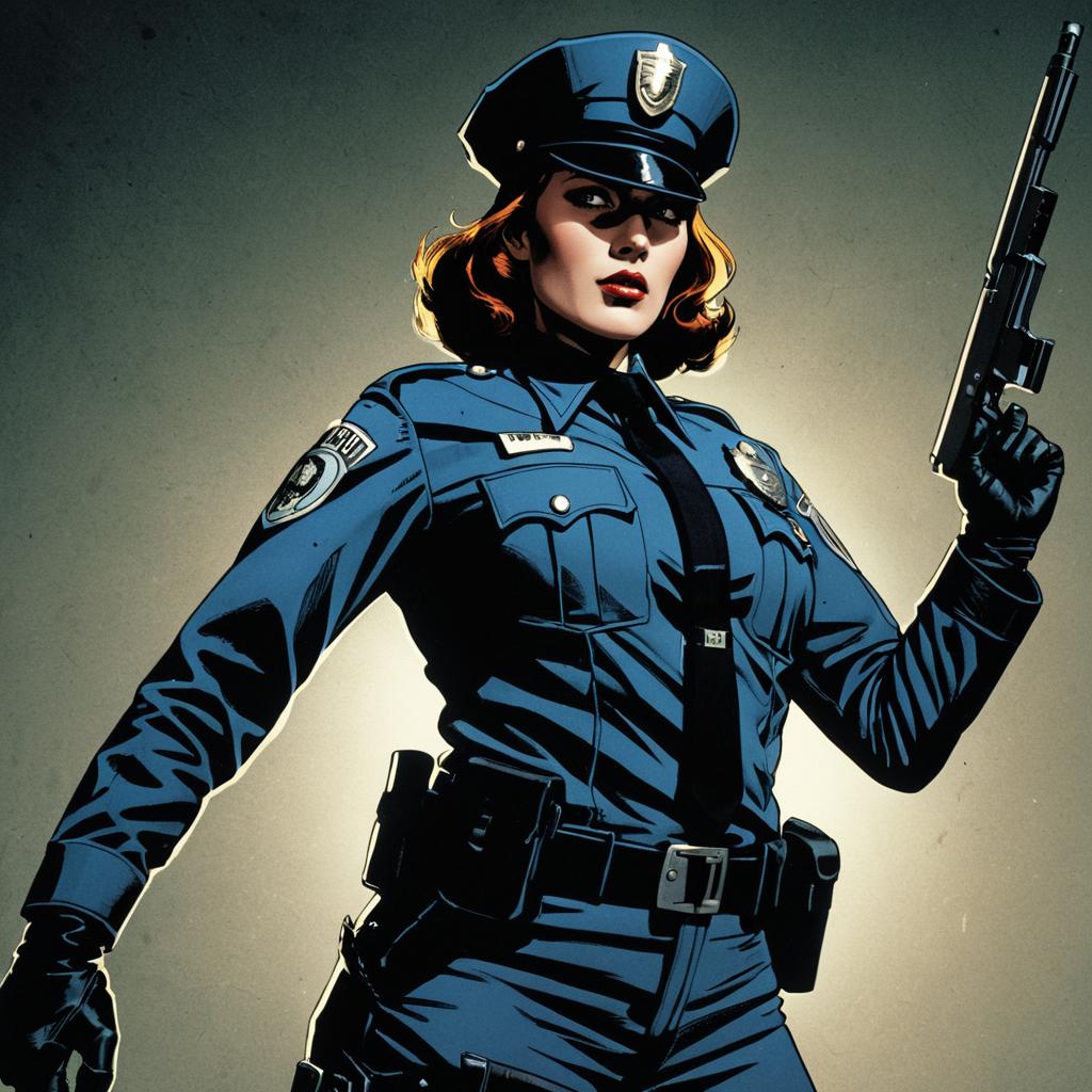 Illustration of a female beat cop inspired by DC Comics and Ariadne, depicted in a Marvel comic dynamic pose with a determined expression. The character is shown in full police uniform including hat and duty belt, featuring flat colors, vector shadows, and neon lighting effects in a comic art style influenced by Andy Kubert.