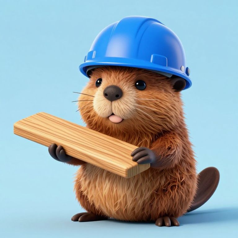 A cute, fluffy beaver wearing a blue safety helmet holds a beautiful, wooden plank, exuding a magical, Pixar-style charm with a light blue background.