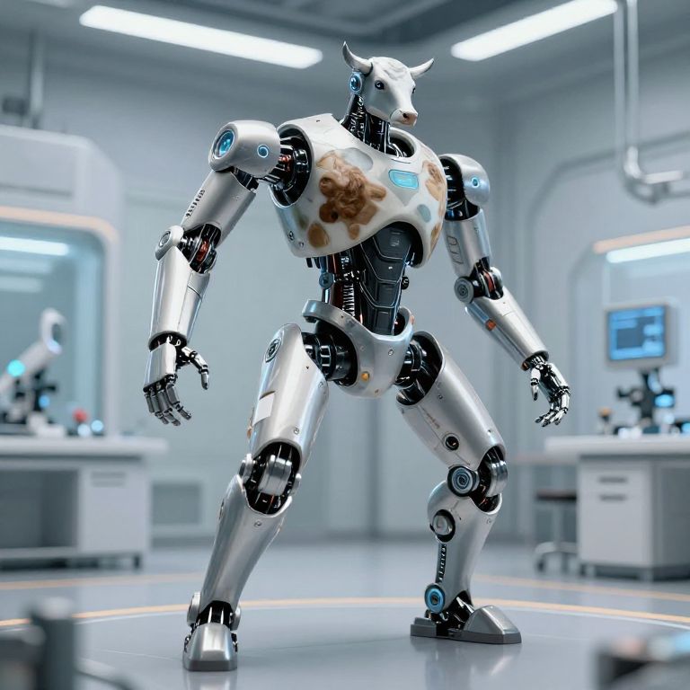 Humanoid cow robot hybrid, sleek metallic body parts with organic cow textures, standing in a high-tech lab environment, dynamic pose, futuristic sci-fi aesthetics, ultra-realistic rendering