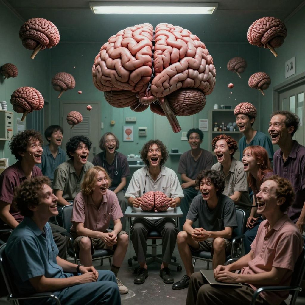 (extremely detailed:1.0), (mental hospital), intense brains, absolutely crazy, (hyper-realistic:1.0), (random people), psychopathic acid brain (cult:1.2), (insane asylum:1.0), (captivating brains), mental patients, hyper-detailed, brain, overwhelmingly happy grinning smiles, (insanely strange:1.2), absolute lunatics, chaotic, (cult of thee infinite mind), psychedelic perfection, occult, high quality, very absurd psychiatric hospital, landscape, small room