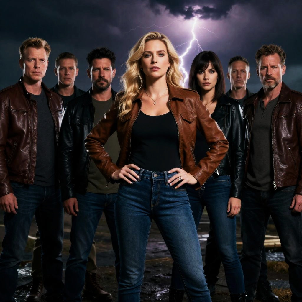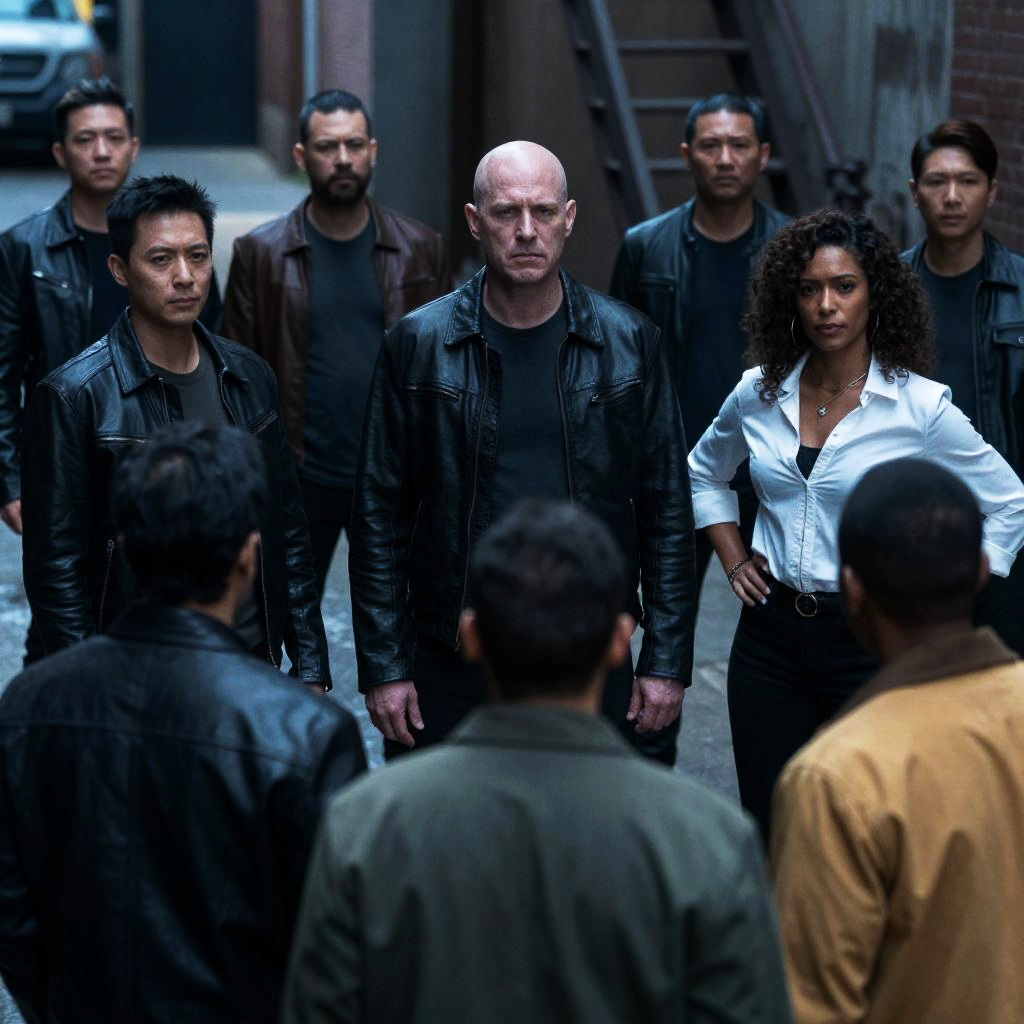 Photograph of "The Wanderers" movie scene. Group of diverse men in leather jackets, some bald, some with dark hair, standing in a gritty urban alleyway. Central bald man in black jacket, intense expression. Curly-haired woman in white shirt, confident pose, right side. Background: shadowy figures, fire escapes. Foreground: three men in green and yellow jackets, backs to camera. Muted blue-gray lighting.