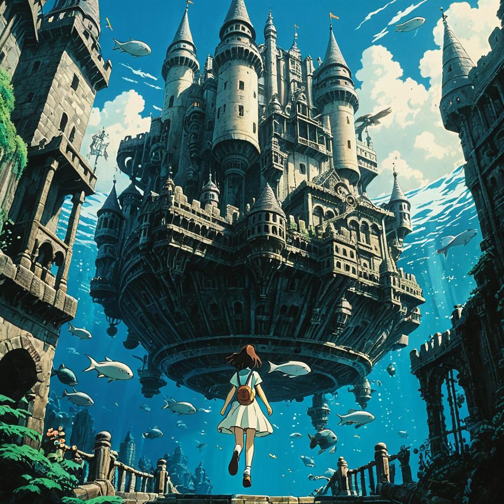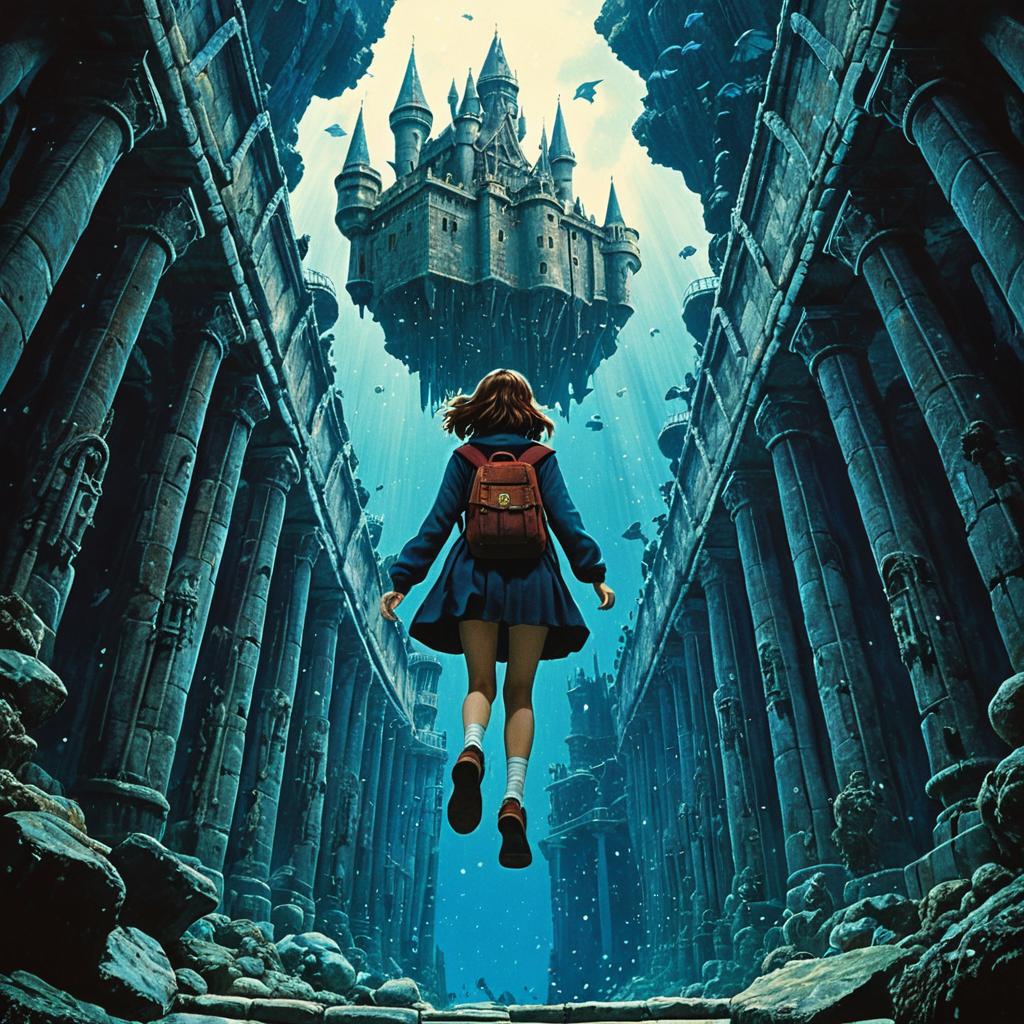 Fantasy underwater scene featuring a detailed floating castle surrounded by fish and underwater architecture. A young girl in a white dress with brown hair is ascending towards the castle, set against a blue aquatic background with sunlit water beams.