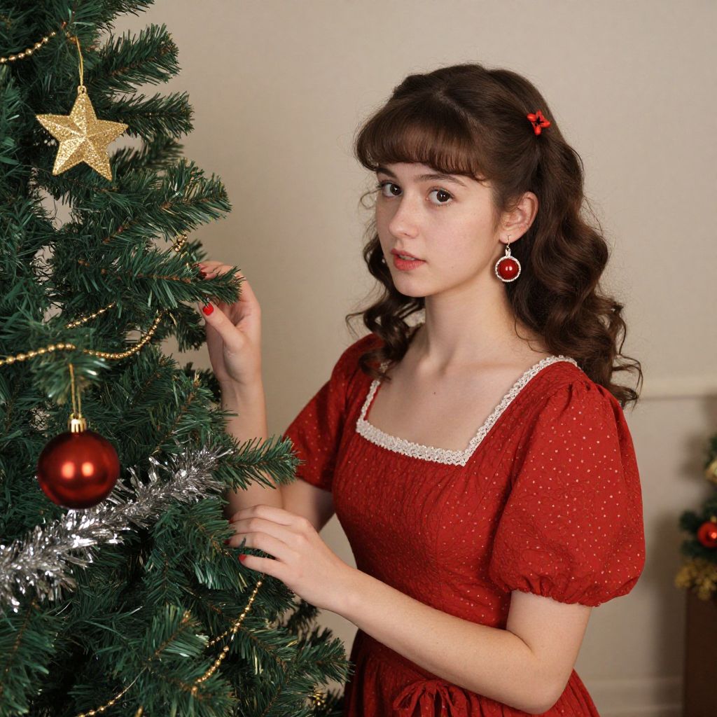 Vintage christmas outfit, 1girl, solo, christmas tree, realistic, christmas, hair ornament, dress, earrings