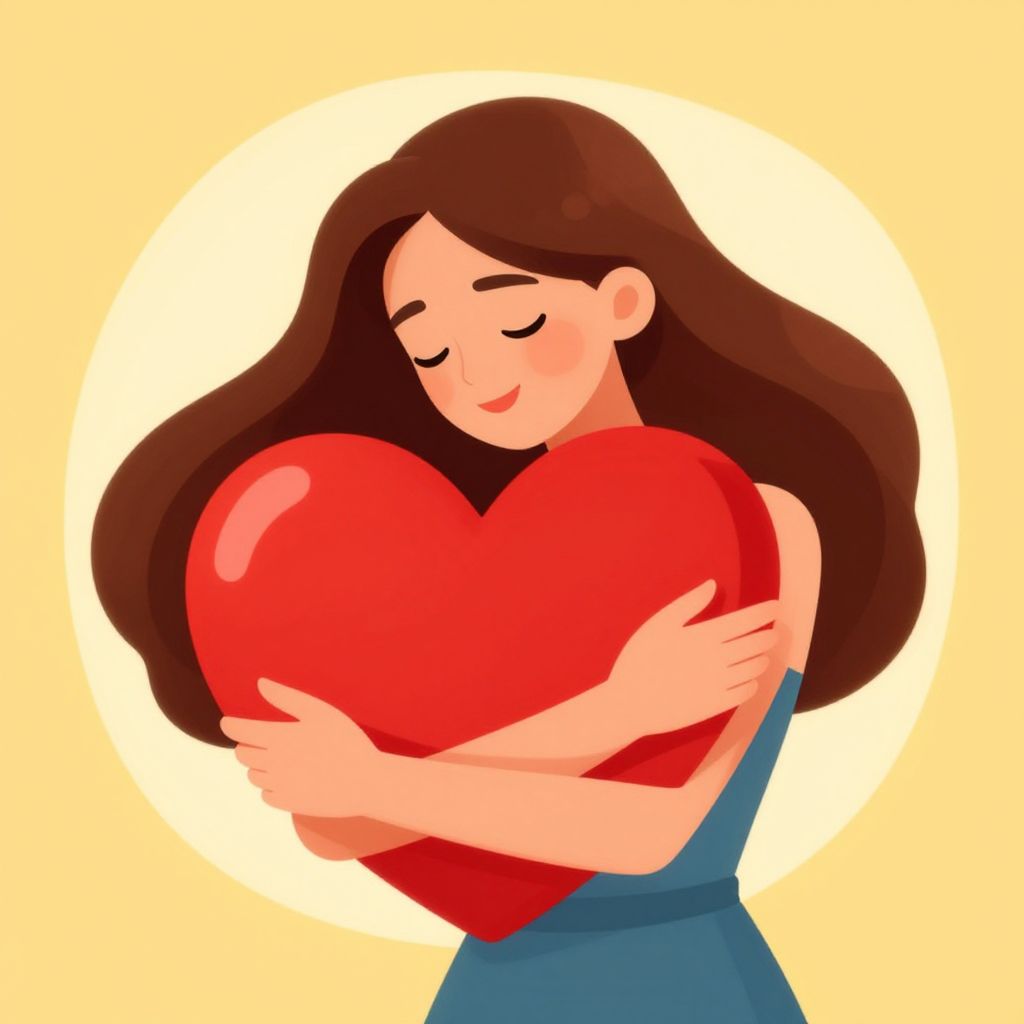 A vibrant vector illustration depicts a young woman with flowing brown hair warmly embracing a large red heart, exuding love and care against a soft golden background.