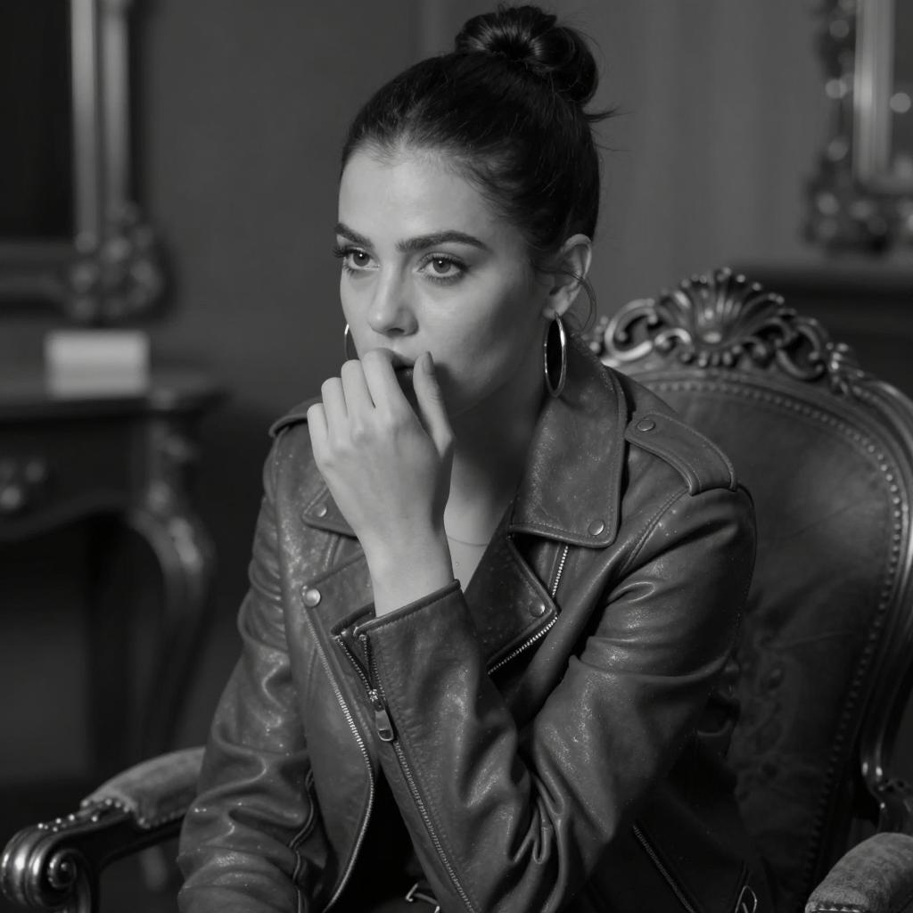 Black and white close-up portrait of a young woman with wavy, shoulder-length hair, wearing an elegant off-the-shoulder dress adorned with a floral brooch. She holds a cigarette in her right hand with a contemplative gaze directed to the side. The background features wooden paneling and blurred figures, one holding a camera, capturing a vintage or classic ambiance.