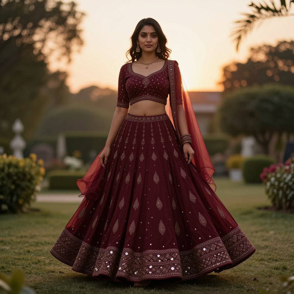 Photograph of a South Asian woman with medium brown skin and wavy black hair, wearing a maroon traditional lehenga choli adorned with silver sequins and intricate embroidery. She has a slender build and is standing in a lush garden at sunset, with a blurred orange and yellow sky in the background. Her outfit includes a crop top with three-quarter sleeves and a flowing dupatta. She is accessorized with a silver necklace and bangles. The grassy lawn has manicured bushes and flowers, with a white statue visible in the background. The overall scene is serene and elegant.
