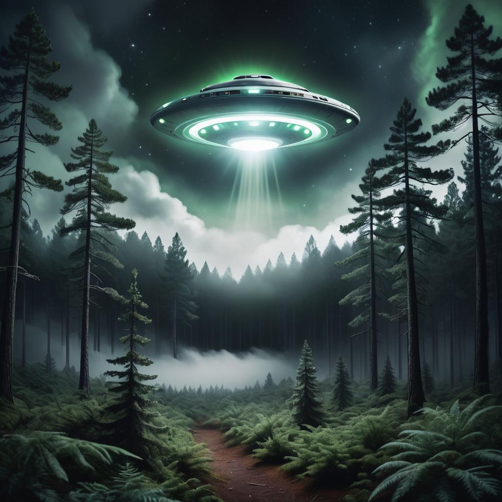 UFO Hovering Over Misty Pine Forest at Night
