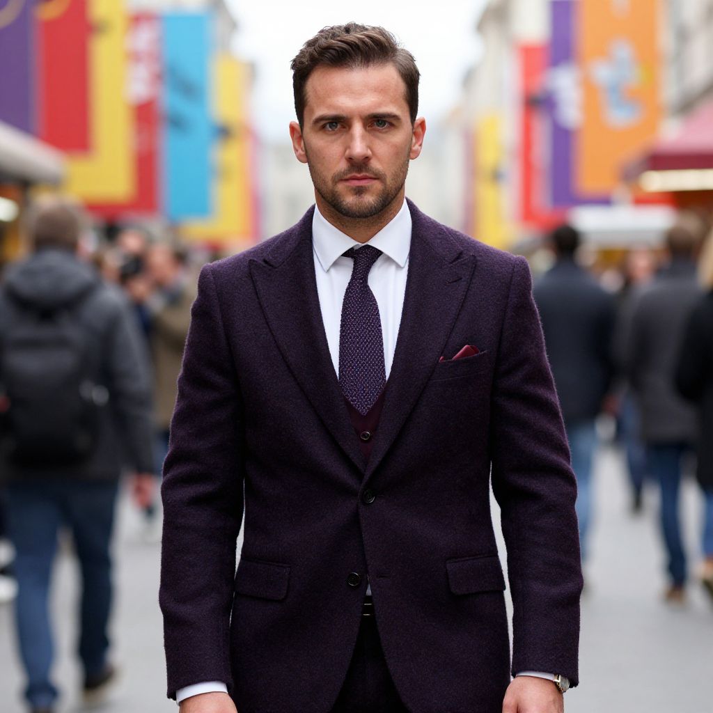 A man, dark purple tweed suit, classic fit, white dress shirt, burgundy leather monk straps, knitted tie, vibrant terminal, colorful banners, bustling travelers, cameraphone style, confident expression. Man has masculine face and piercing eyes