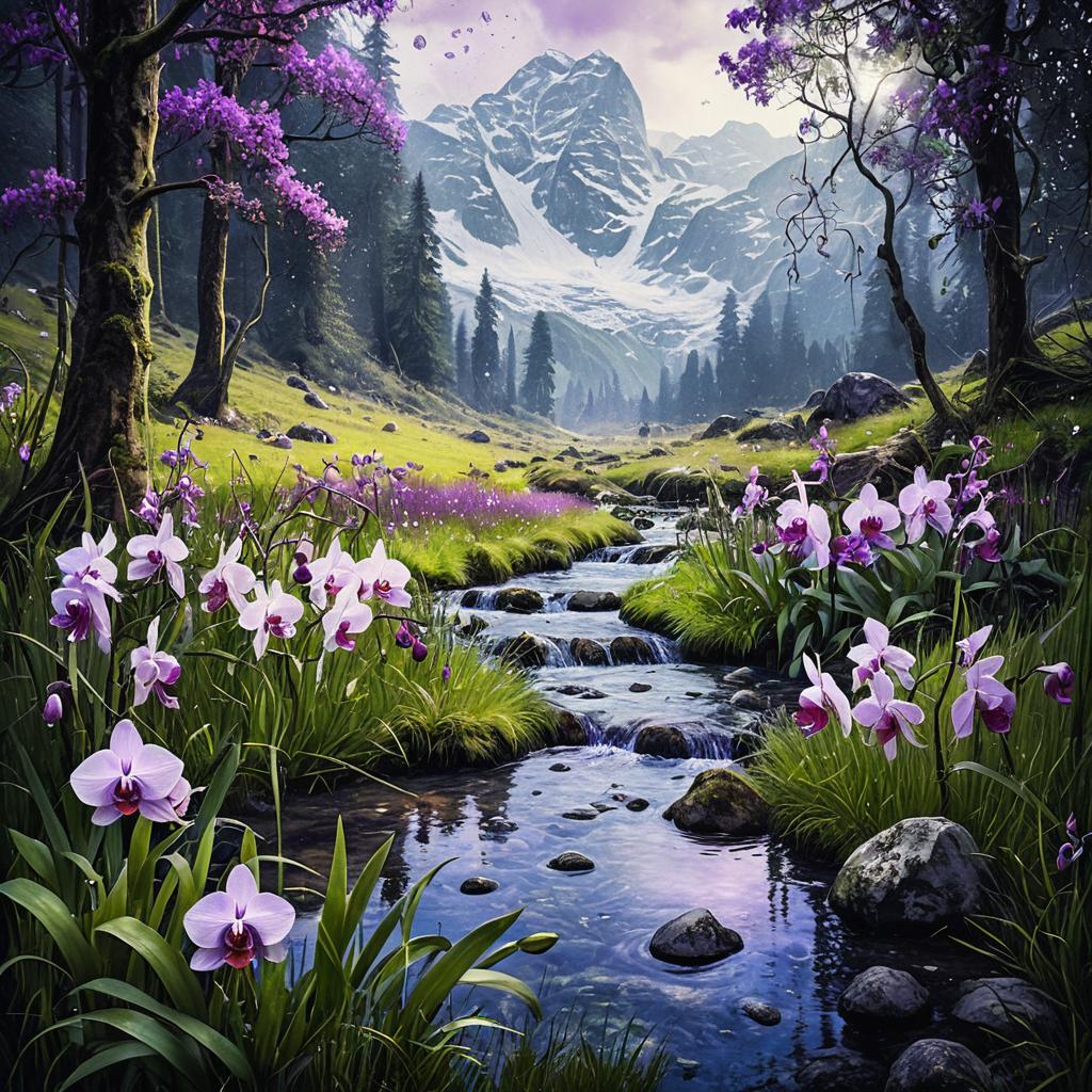Detailed watercolor of a quiet Swiss alpine meadow with wildflowers blooming, a crystal-clear mountain stream flowing gently, delicate brushstrokes, vibrant color palette.