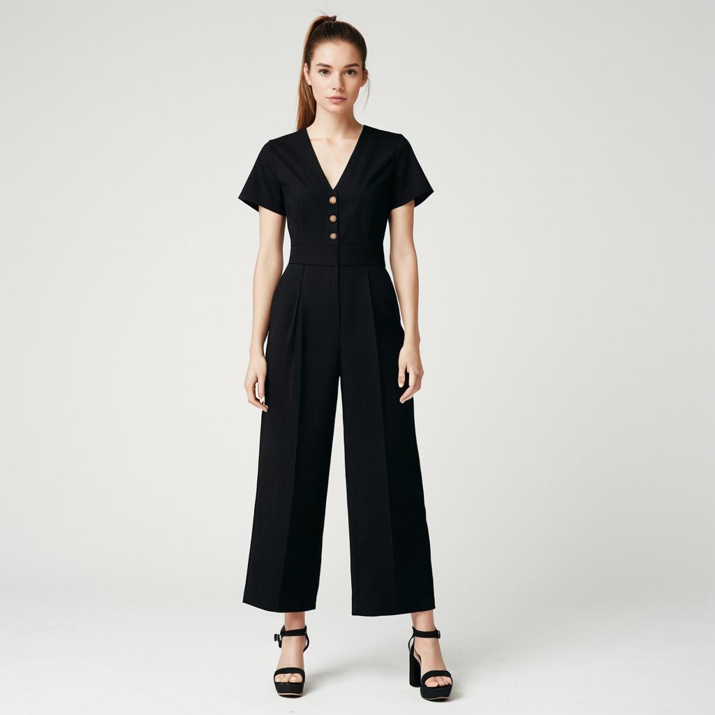 Woman, minimalist chic, black jumpsuit with short sleeves, V-neckline, front button closure, fitted waist, cropped straight-leg pants, brown and black strappy platform sandals, minimalist makeup, sleek high ponytail, white studio background