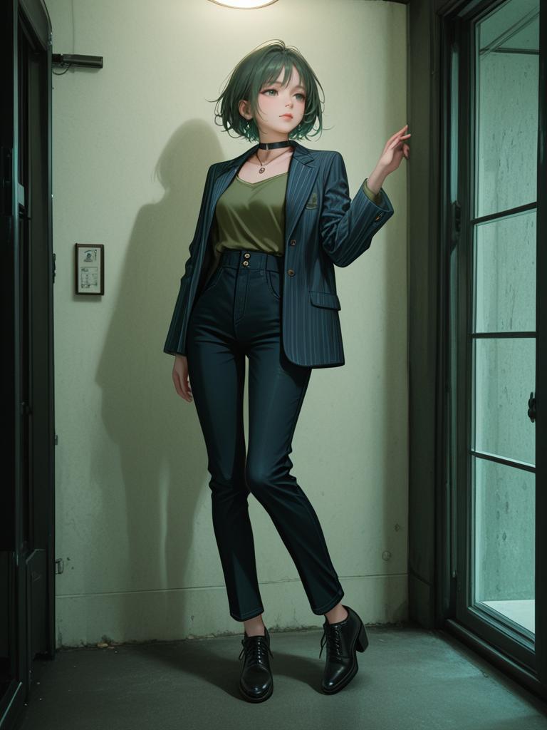 1girl, realistic face, full body shot, Woman, professional attire, fitted blazer in gray with fine herringbone pattern, notched lapels, white silk button-up blouse, tucked into tailored high-waisted trousers in matching gray, teardrop pearl earrings, white studio background.