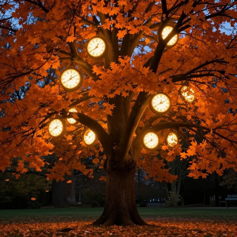 Glowing clocks embedded within vibrant orange foliage adorn a majestic tree, their luminous faces casting a warm radiance over the scene as they blend seamlessly with the blossoming branches and scattered petals below.