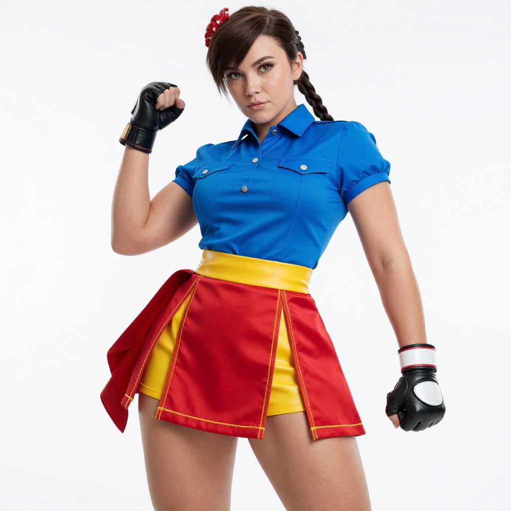 Photograph of a confident woman with pale skin and dark brown hair in a side braid, wearing a blue short-sleeved button-up shirt, black fingerless gloves, and a red and yellow pleated mini skirt. She has a red hair bow on the left side of her head and is striking a powerful pose with her right fist raised. The background is plain white, making her vibrant outfit stand out. Her expression is determined, and her stance exudes strength and readiness. The image has a clean, high-contrast style.